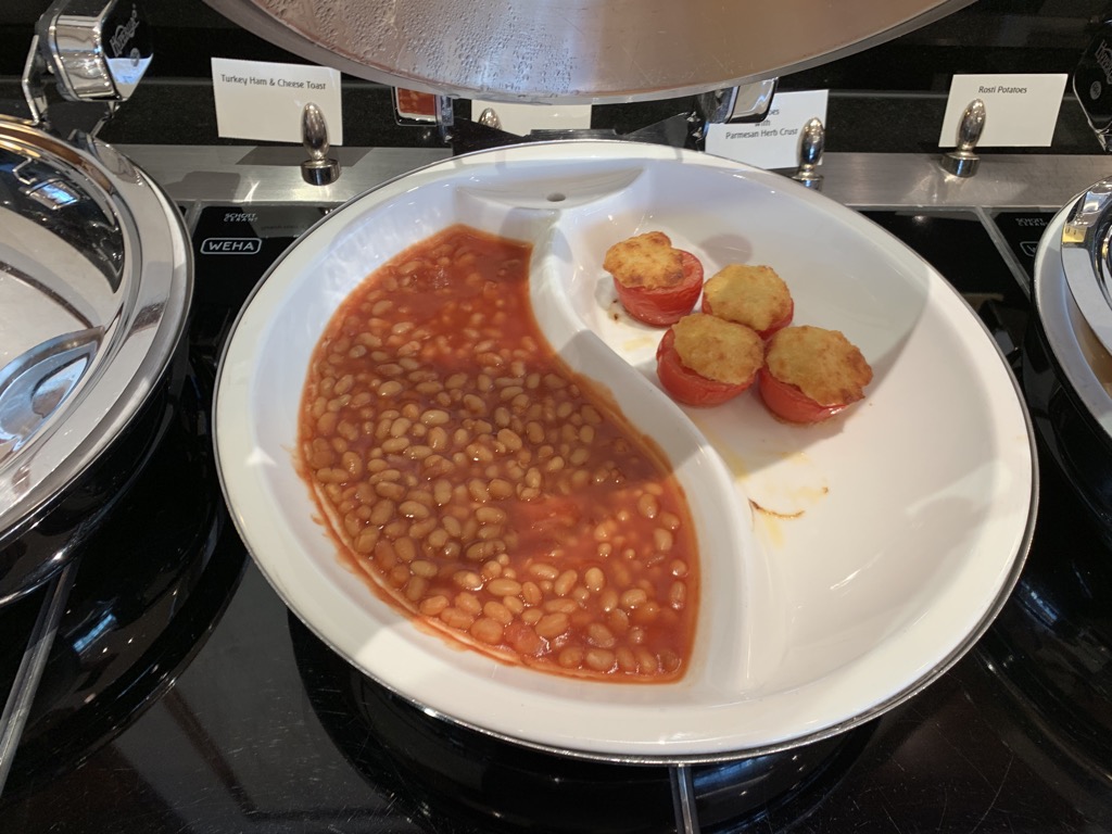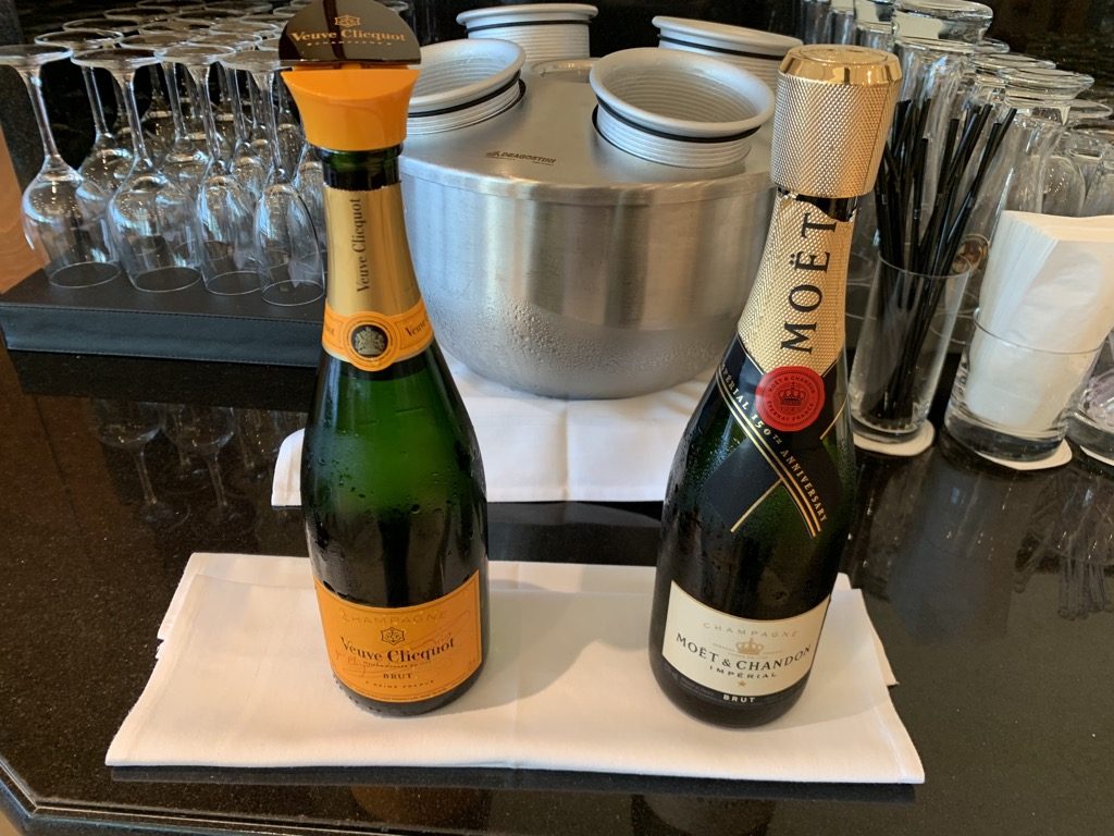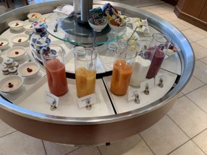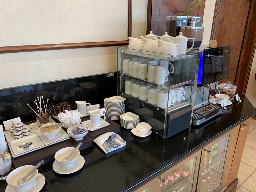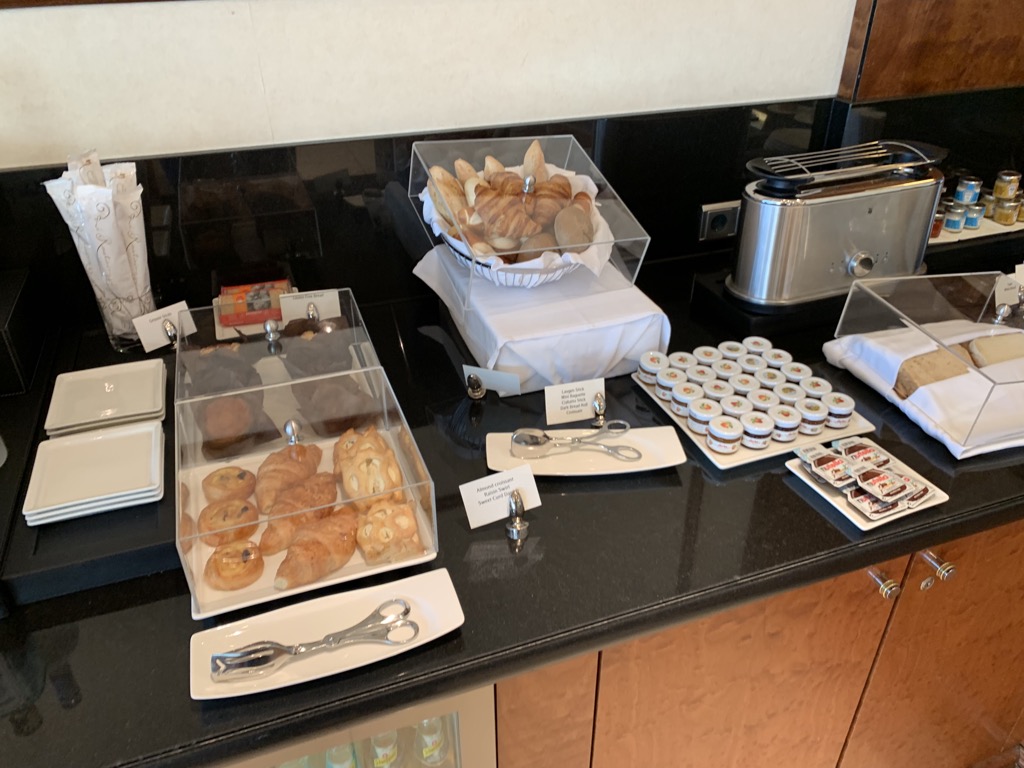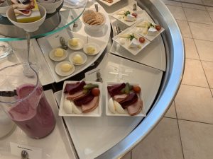 Das Angebot an Getränken ist den gesamten Tag über identisch und neben diversen Säften und Softdrinks gab es auch eine große Auswahl an Spirituosen, Bier, Wein und Champagner. Ich habe mich am Morgen noch mit Kaffee begnügt und auf den deutlich besseren Champagner im Flugzeug gefreut.