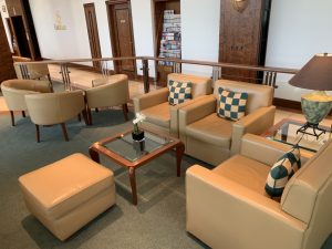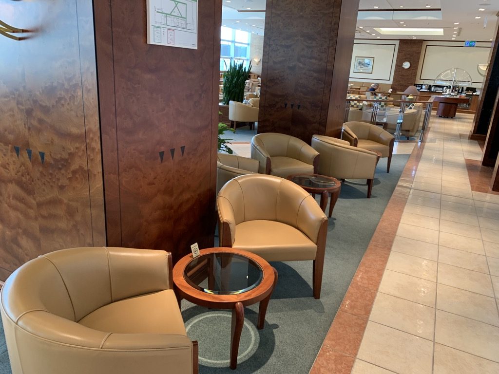 Direkt nachdem man meine Bordkarte eingelesen hatte, wurde ich nach rechts in die Lounge gebeten, welche erst einmal eine riesige Sessellandschaft mit überraschend vielen Sesseln bot. Wenn man bedenkt, dass Emirates immer maximal ein Flugzeug in Frankfurt hat, ist diese Lounge sehr großzügig dimensioniert, allerdings stellt man hierdurch auch sicher, dass es nie wirklich zu Platzproblemen kommt.