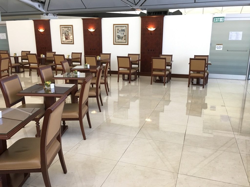 Gegenüber vom Loungebereich befindet sich das große Restaurant in der Emirates Lounge Hongkong. Hier findet man neben einer Vielzahl an Tischen und Stühlen zum Essen auch das Buffet zur Selbstbedienung.