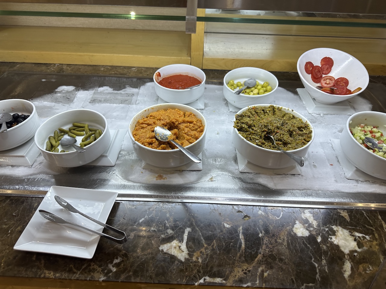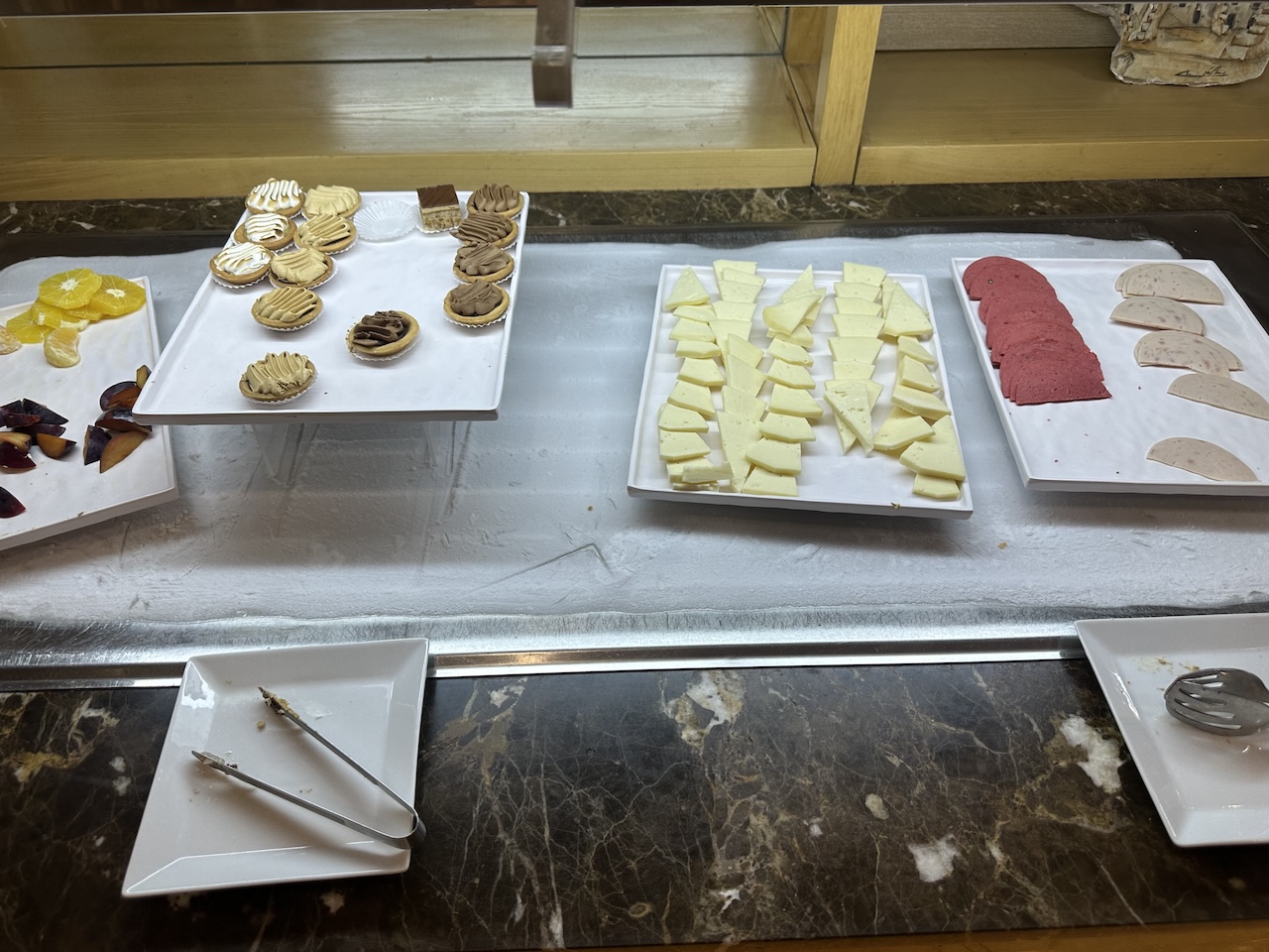 Alle Snacks und Mahlzeiten findet man in einem Buffetbereich, das Angebot richtet sich nach der Tageszeit. Wir waren am Nachmittag in der Lounge und konnten uns Salate zusammenstellen, Sandwiches holen oder auch etwas Warmes essen. Im Angebot waren auch Beilagen und Brot, als Nachtisch gab es Kuchen und Käse.
