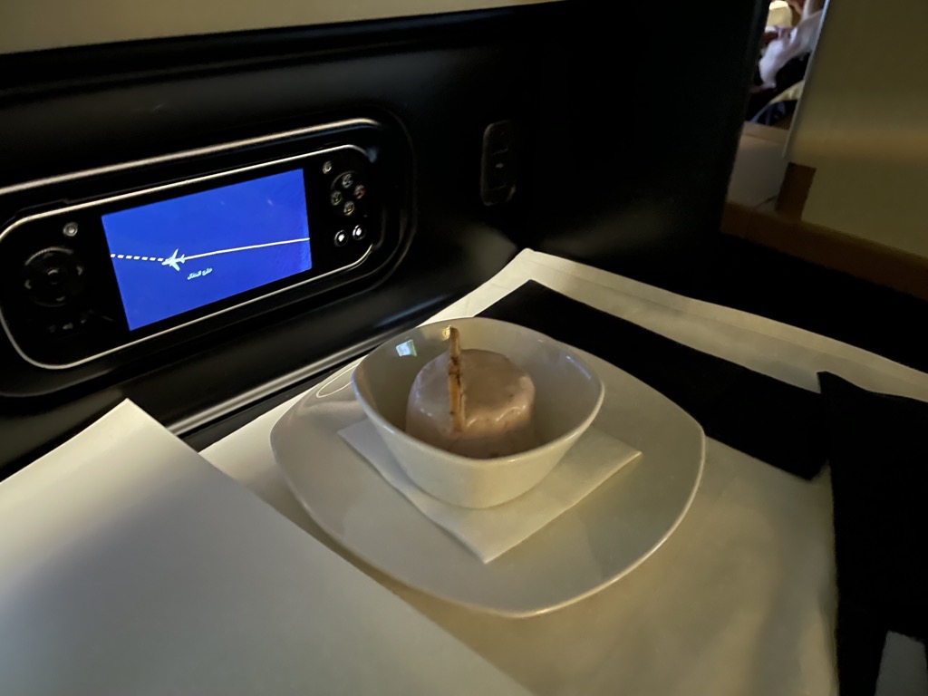 Für mich passte dies aber durchaus gut vom Timing und ich bestellte direkt nach dem Hinsetzen mein Abendessen, zusammen mit meinem Welcome Drink, der auch vor dem Start sehr schön serviert wurde, hier noch ohne Nüsse, aber nach dem Start gleich noch einmal mit warmen Nüssen.