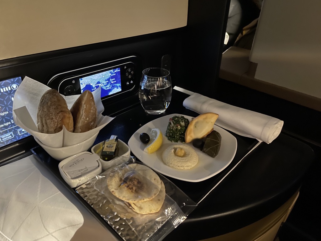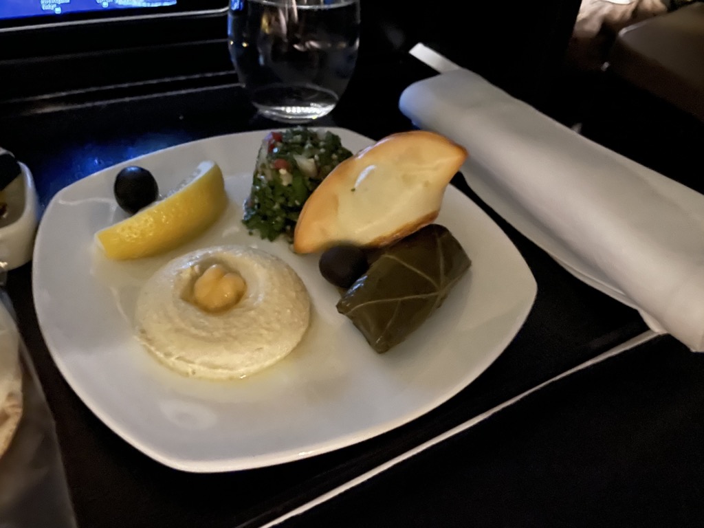 Meine Vorspeise, das arabische Mezze, wurde auch sehr schnell nach dem Start serviert und schmeckte mir durchaus, allerdings muss ich sagen, dass ich das Mezze bei Emirates doch etwas lieber mag, aber die Geschmäcker sind hier sicher verschieden.