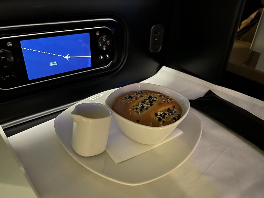 Nachdem Theo auf meinem Arm geschlafen hatte und ich ihn nicht ablegen wollte, hat die Crew etwas unkonventionell das Essen auf der Ablage neben meinem Sitz serviert. Auch wenn es nun auf den Bildern etwas eigen aussieht, für mich absolut die perfekte Lösung.