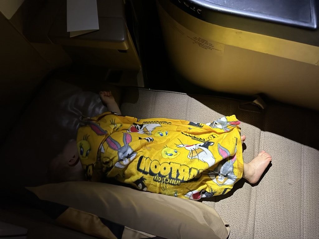 So wurden uns z.B. direkt an der Flugzeugtür die Kinderwägen und das meiste Handgepäck abgenommen und in den Gepäckfächern verstaut, was die Situation sehr entspannte und der Purser fragte mich auch ob er die Kabinentemperatur für die Kindern verändern soll, damit sie besser schlafen. Letzteres ist auch einfach im Interesse aller Passagiere.