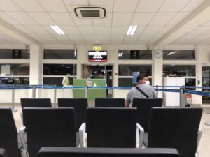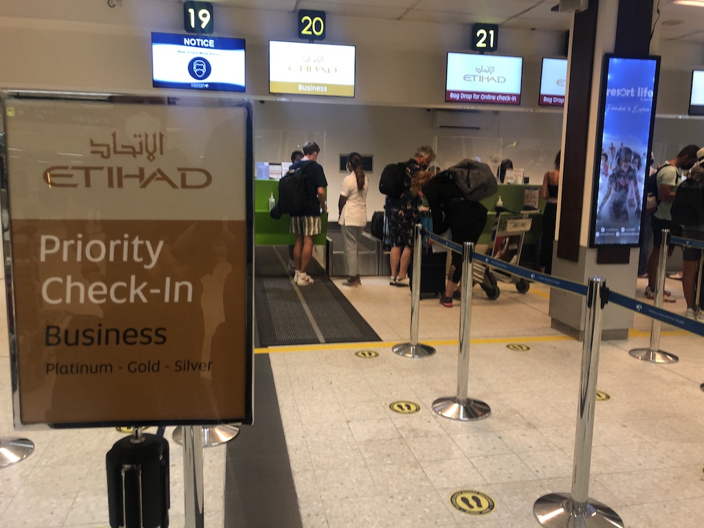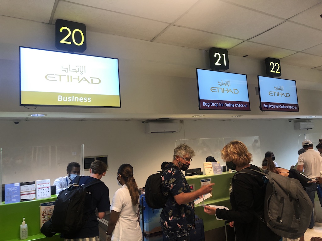 Die Reise startete am etwas kleineren Flughafen in Male. Nach einer ersten Sicherheitskontrolle ging es direkt zum Check-In, wo es einen eigenen Schalter für Gäste der Business Class und Statuskunden gab. Niemand war vor uns und wir kamen direkt zu einem netten Agenten, der neben den Pässen auch den negativen Covid-Test sowie die Einreiseanmeldung für Deutschland verlangte. In weniger als fünf Minuten waren wir das Gepäck los und bekamen die Bordkarten mit dem Hinweis auf eine erneute Kontrolle des Tests am Gate.