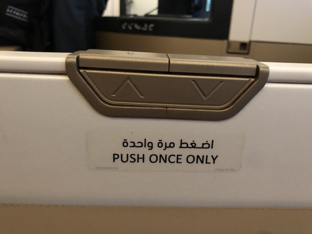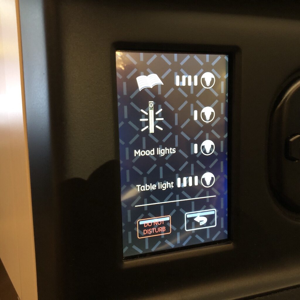 Direkt an einer Ablage ist die elektronische Verstellung für den Sitz angebracht, darüber befindet sich ein Touchpad um z.B. die Beleuchtung zu regulieren. Die Fernbedienung befindet sich daneben, dort kann man den Monitor bedienen, mit anderen Gästen kommunizieren oder den kleineren Bildschirm für die Airshow nutzen.