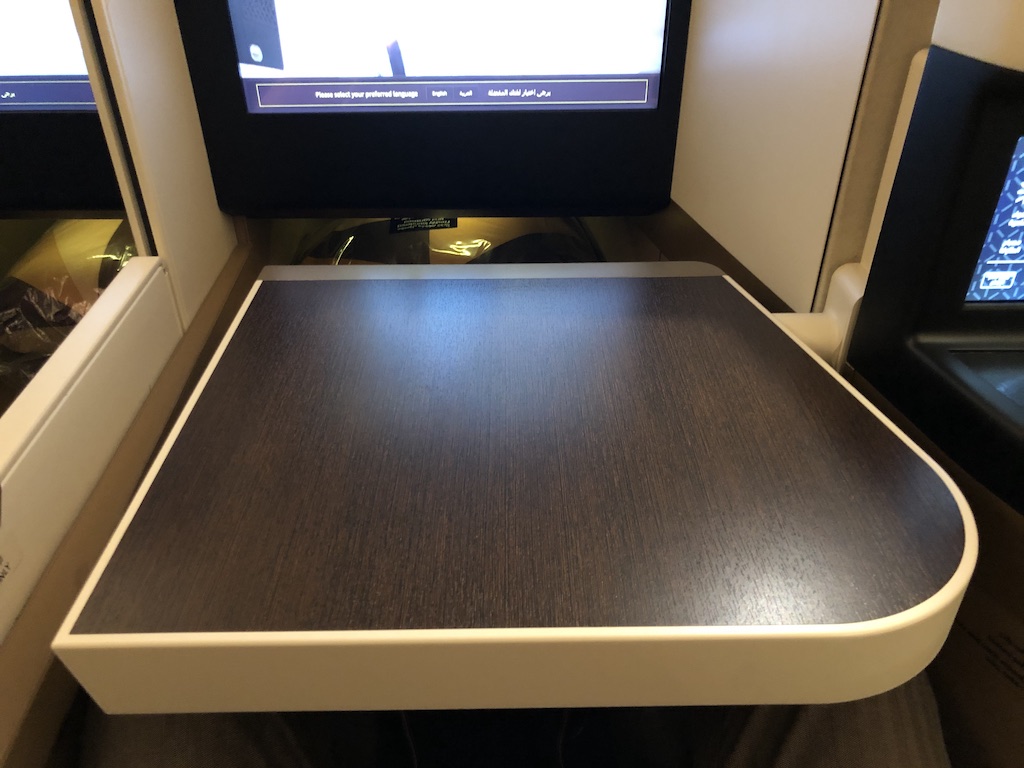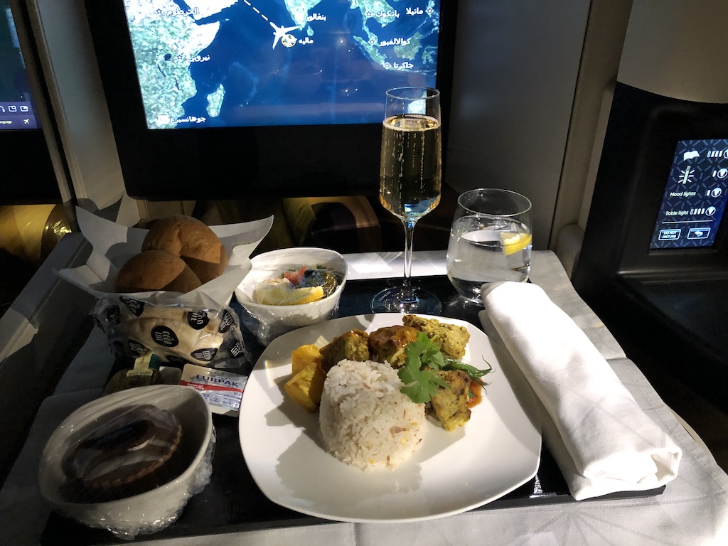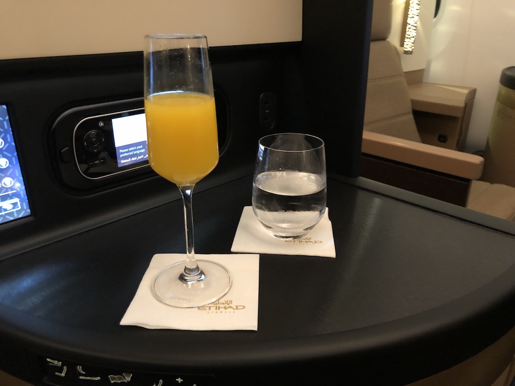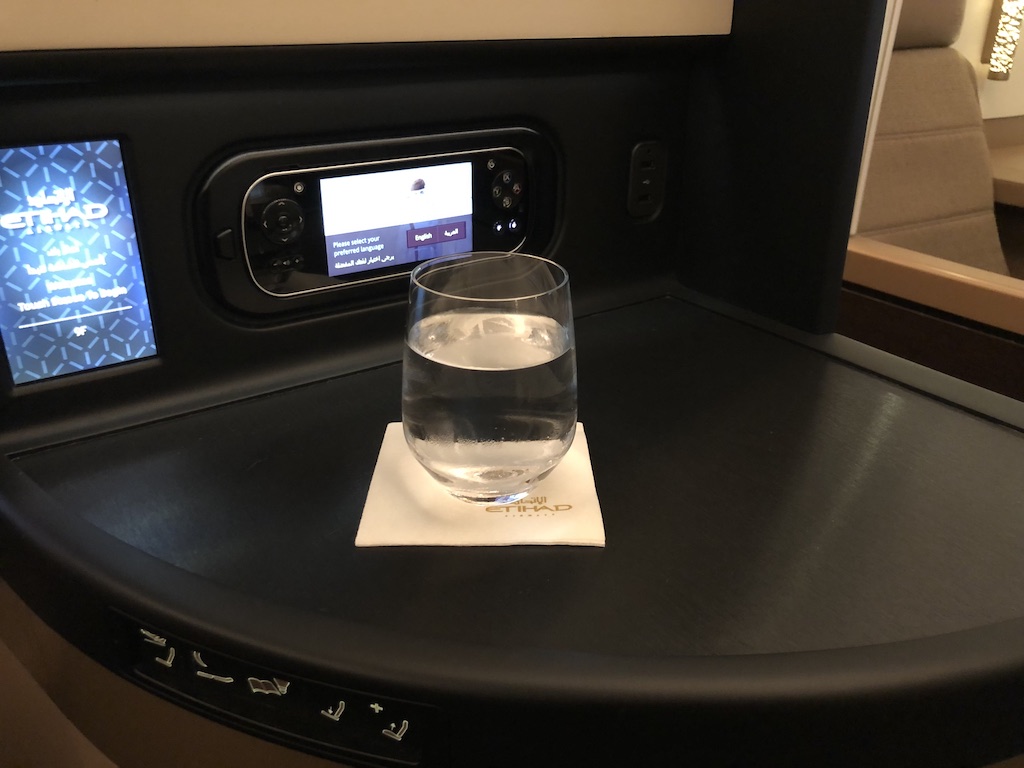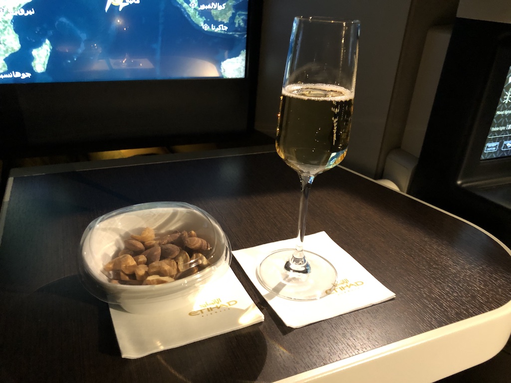 Überpünktlich verließen wir die Position, noch bevor das Video zu Ende war, hoben wir in Richtung Abu Dhabi ab. Der Tisch lässt sich sehr leicht ausfahren, wirkt stabil und ist nach vorne verschiebbar. Die Crew war flink und versuchte zur späten Stunde den Service schnell durchzuführen, damit etwas Zeit zum Schlafen bleibt. Der versprochene Champagner wurde mit Nüssen serviert.
