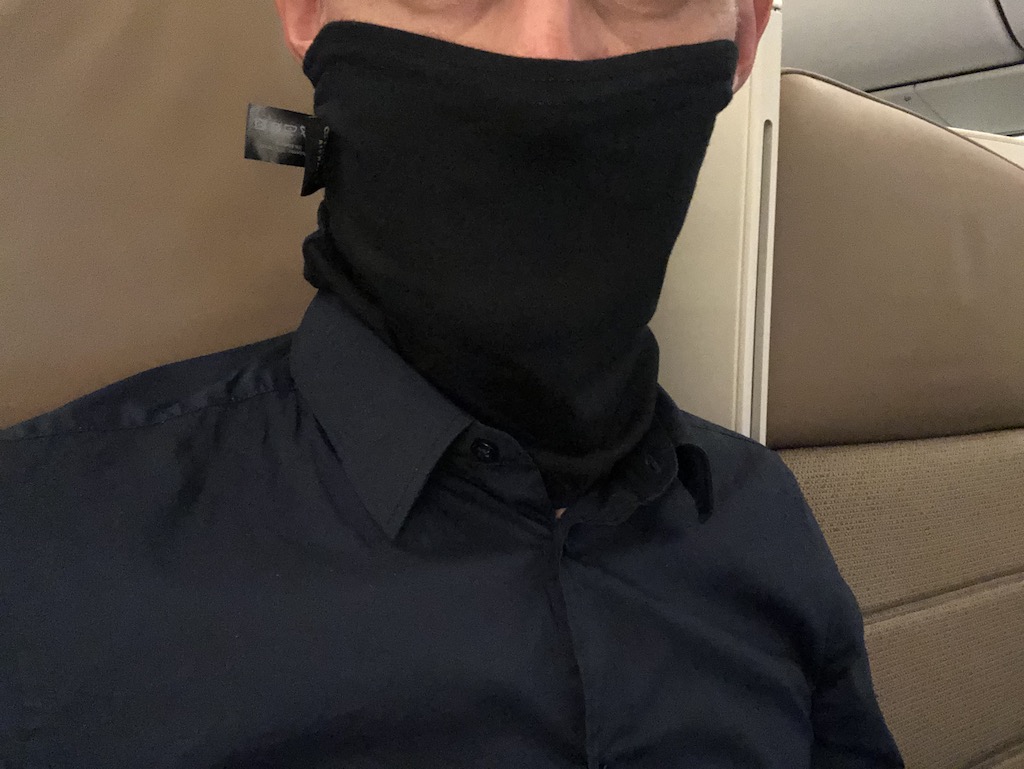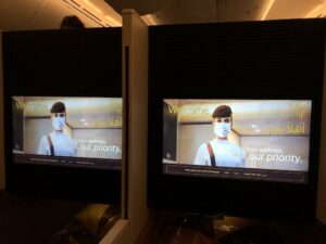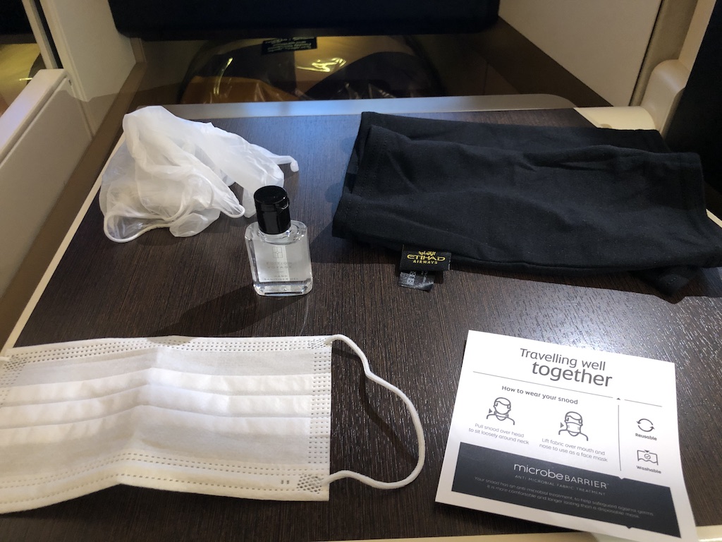 Da die Passagiere der Economy Class nicht durch die Business Class eingestiegen sind, konnten die Flugbegleiter die Zeit nutzen und weitere Dinge verteilen. Ein vollwertiges Amenity Kit gab es für den kurzen Flug nicht. Zu einem Hygienebeutel mit zwei verschiedenen Masken, Handschuhe und Desinfektionsmittel wurden noch Socken sowie eine Schlafbrille ausgehändigt. Interessant war dabei Stoffmaske, die bequem war und auch beim Schlafen nicht weiter störte.