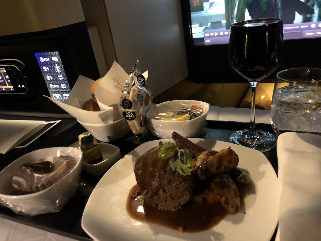 Das Steak hat dafür geschmacklich überzeugt, der Shiraz war für mich der perfekte Begleiter dazu. Die Crew achtete darauf, uns immer gemeinsam zu bedienen und brachte Essen und Getränke gleichzeitig von jeder Seite.