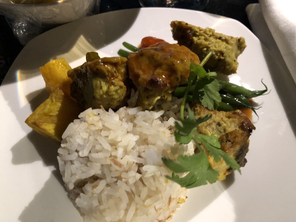 Die arabische Mezze scheint der gängigste und beliebteste Starter zu sein und kommt auf dem kurzen Flug automatisch mit. Die Hauptgänge waren schön angerichtet, doch leider nur noch lauwarm.
