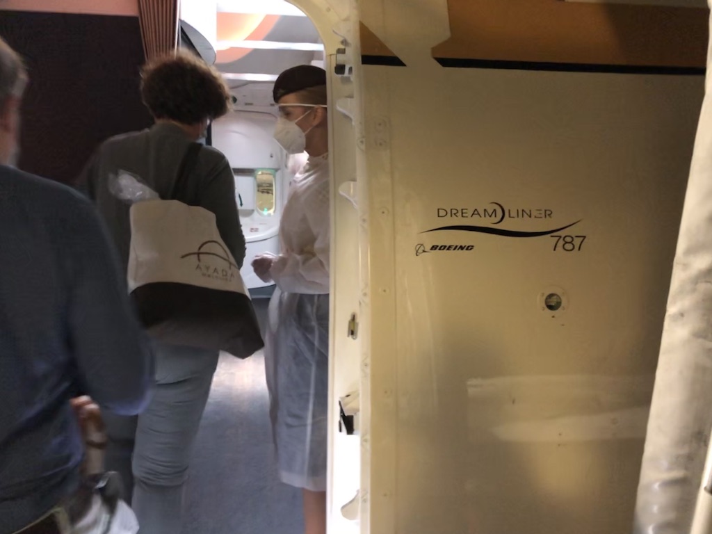 Etihad betreibt insgesamt 39 Dreamliner, davon 30 der kleineren B787-9. Diese ist ist wiederum in zwei verschiedenen Varianten bestuhlt. Je nachdem ob eine First Class eingebaut ist, hat die Economy Class eine Kapazität von 199 bzw. 271 Sitzen. Die Business Class Kabine ist durchgehend mit 28 Sesseln ausgestattet. Das Flugzeug wurde wenige Tage vor meinem Rückflug von den Melediven von einem Airbus A320 auf die B787-9 geändert.