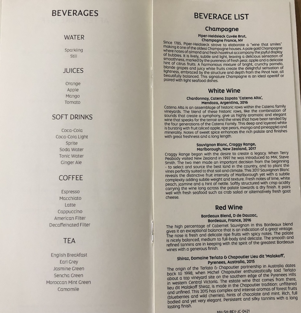 Bei der Gelegenheit wurde auch die Speisekarte gebracht, kurze Zeit später konnte man auch schon einen Aperitif und den Hauptgang für die Zeit nach dem Start bestellen.