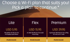 An Bord ist Wi-Fi gegen Gebühr erhältlich, zur Auswahl stehen drei verschiedene Pakete. Wird das Volumen nicht aufgebraucht, kann man dieses auf dem Anschlussflug nutzen.