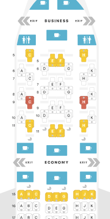 Die Sitze der Business Class sind von Reihe 5-11 in einer versetzten 1-2-1 Anordnung verbaut. Die Reihen 1 und 2 gibt es nur bei Flugzeugen mit First Class.