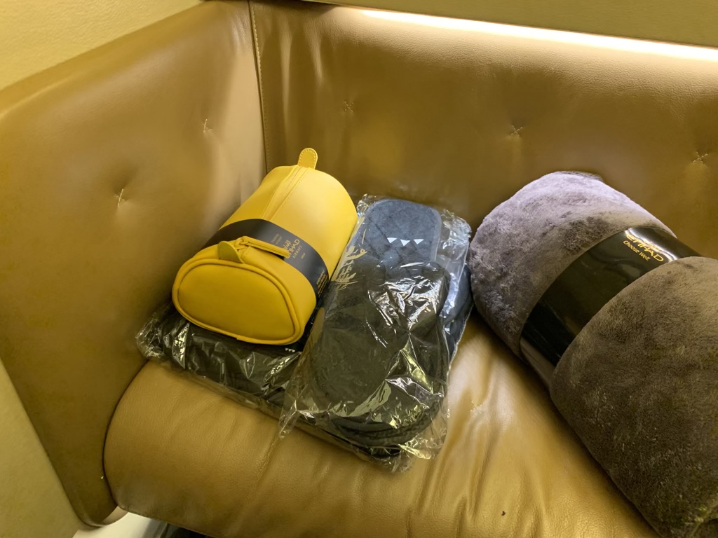Kurz nachdem ich mich gesetzt habe, wurden mir auch ein Amenity Kit, ein Pyjama und wenig später auch Slipper überreicht, wobei man die Slipper schön am Boden der Suite drapiert hat. Das Amenity Kit und den Pyjama hat man etwas wortkarg einfach auf den Ottomane gelegt.
