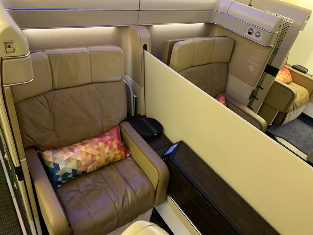 Für die First Class gab es eine eigene Fluggastbrücke, welche auch von einer Mitarbeiterin bewacht wurde. Das Einsteigen war hierdurch sehr entspannt, auch wenn ich etwas überrascht war, als mir die Flugbegleiterin an der Tür zwar den Weg zu meinem Sitze gezeigt hat, mich aber nicht dorthin begleitet hat, wie es in der First Class üblich ist.
