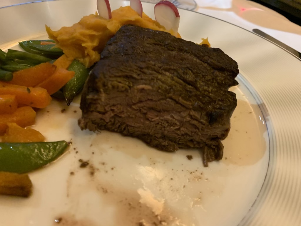 Mein Rinderfilet als Hauptspeise war grundsätzlich gut, allerdings war ich hiervon nicht wirklich begeistert. Besonders das Filet war leider komplett durchgegart und auch nicht gewürzt, was ich sehr schade fand, insbesondere da ein Koch an Bord war, der extra noch fragte, wie er das Rinderfilet garen soll.