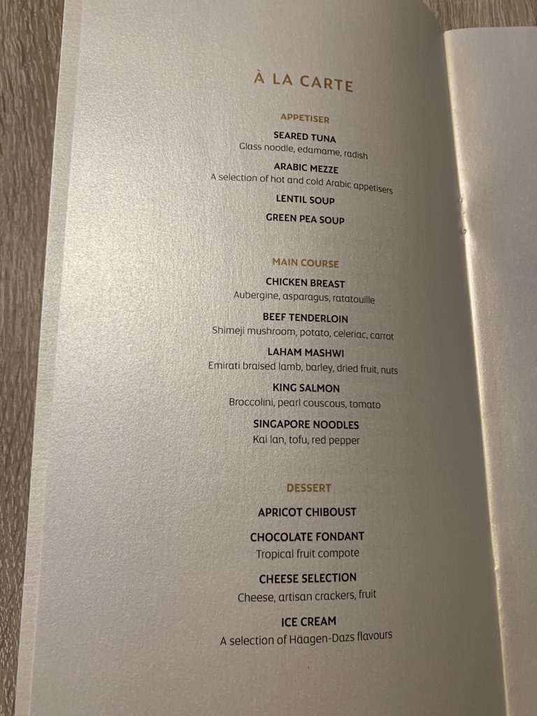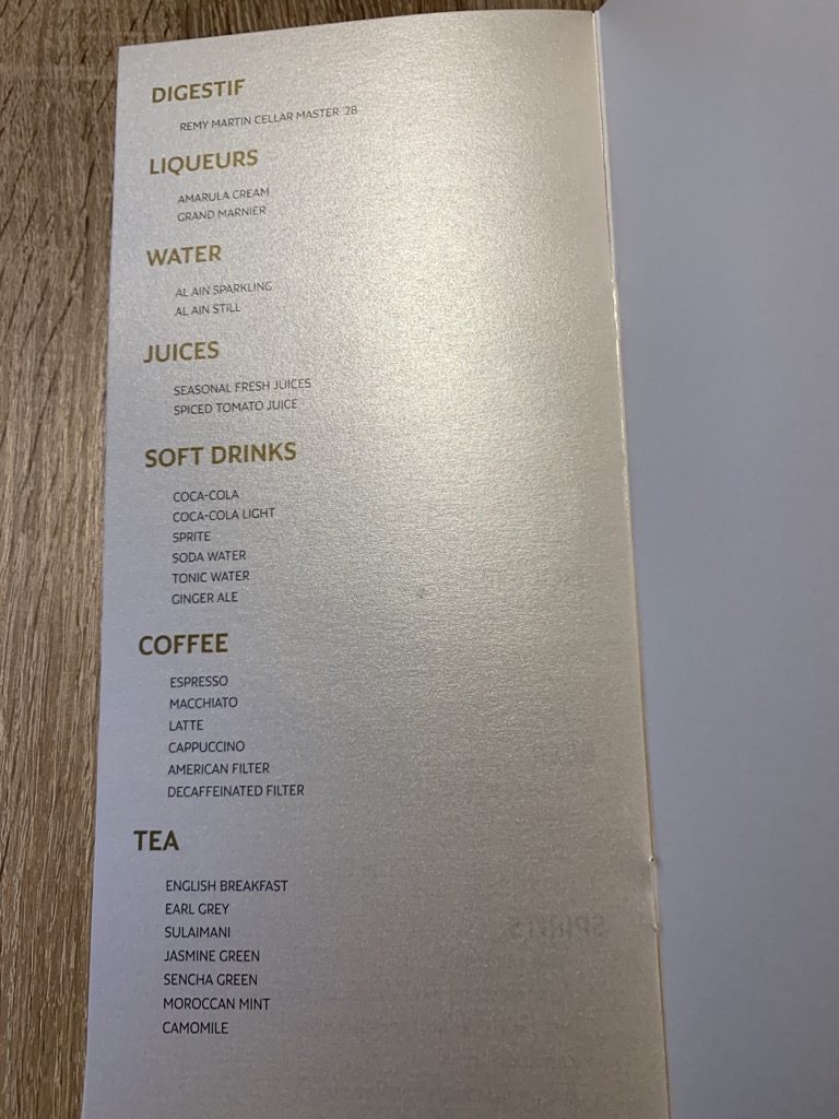 Interessant fand ich, dass man neben Abendessen auch Frühstück auf der Karte hatte und das bei einer Abflugszeit um 21:00 Uhr am Abend und einer Ankunft in Abu Dhabi um 23 Uhr.