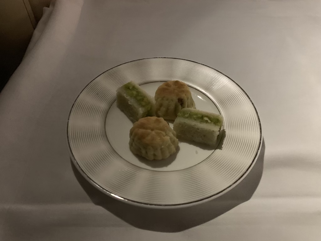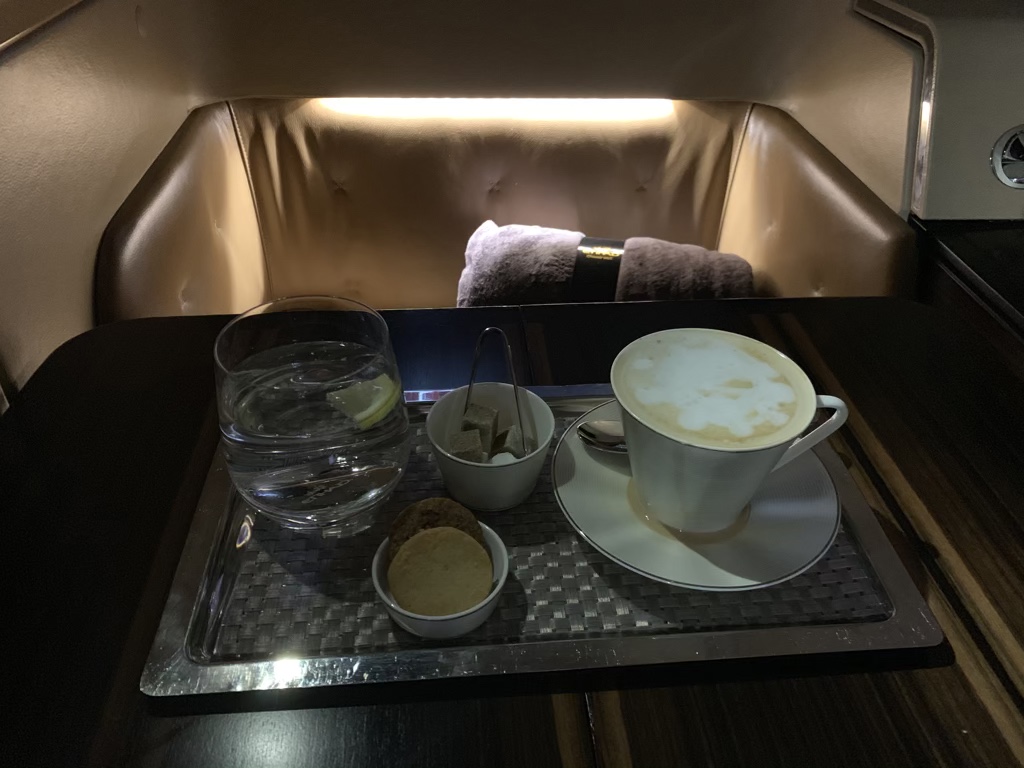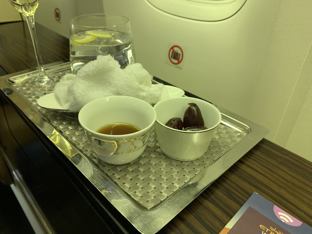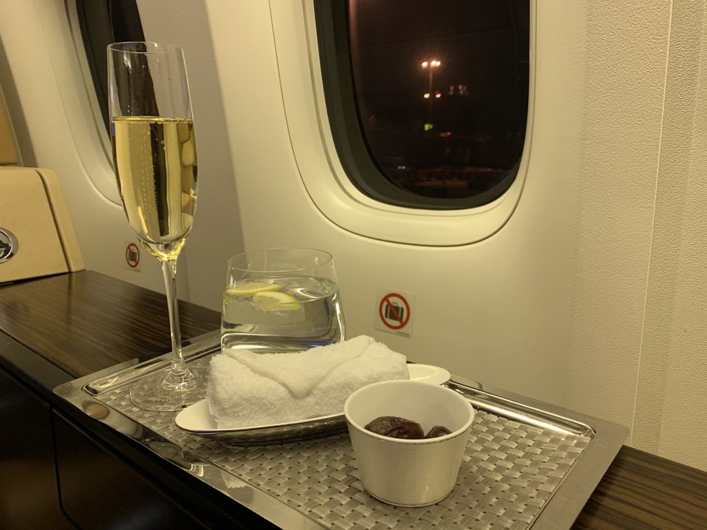 Nachdem ich mich eingerichtet habe, kamen kurz nacheinander die First Class Flugbegleiterin und der Koch zu meinem Sitz und haben sich vorgestellt. Man hat mich hier direkt gefragt was ich trinken wolle und brachte mir mein Glas Champagner zusammen mit einem Wasser, einem heißen Tuch und Datteln.