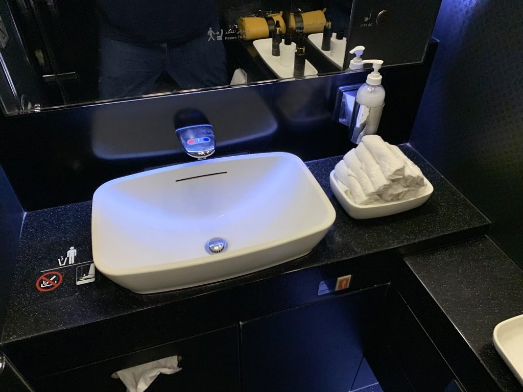 Die First Class in der Etihad Boeing 777-300 verfügte über zwei Toiletten für die maximal acht Gäste. Dabei waren die Toiletten den ganzen Flug über in einem sehr guten Zustand und wurden wohl nach jedem Gast gereinigt.