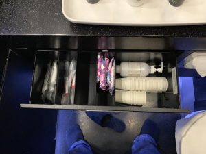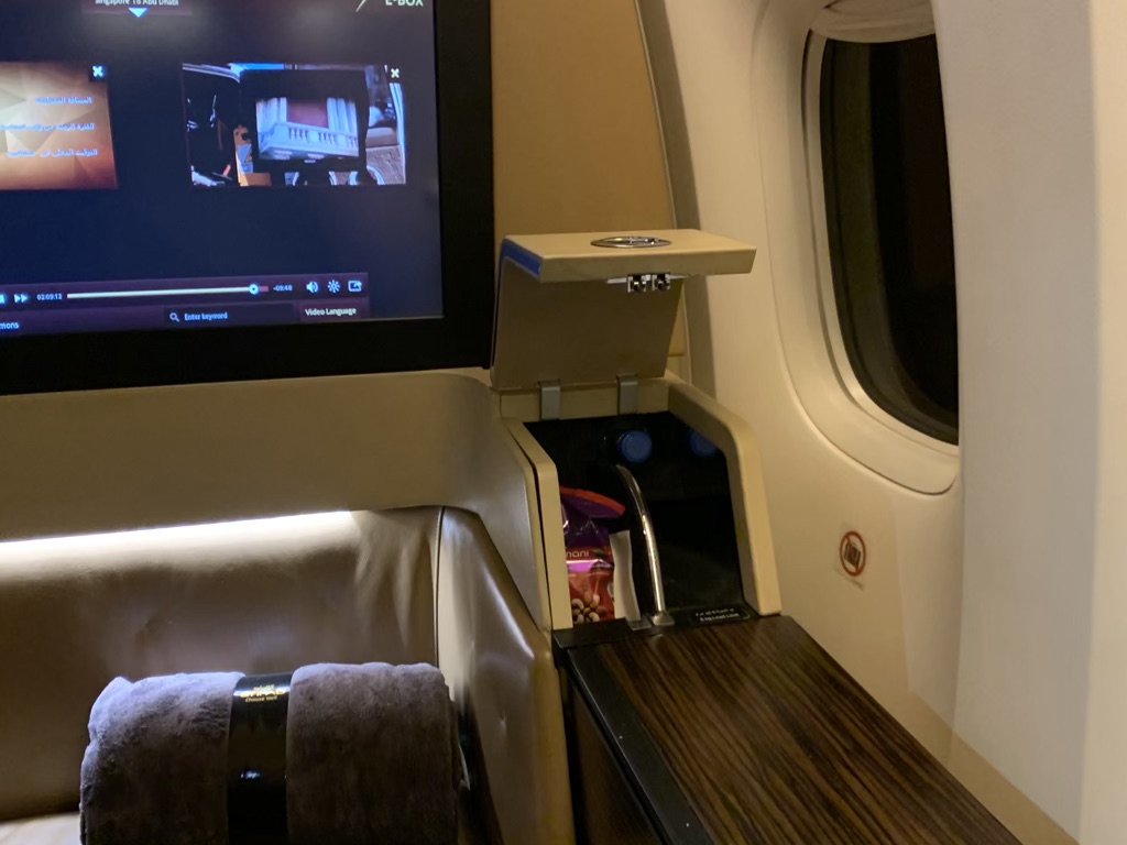 Neben dem Bildschirm befand sich die Minibar der Suite, wobei diese lediglich mit zwei Flaschen Wasser und einer Tüte Erdnüssen bestückt war. Während ich eine feste Verstauposition für eine Falsche Wasser immer sehr angenehm finde, hat sich mir der Sinn dieser Minibar (wie die allen Mini Bars im Flugzeug) noch nicht ganz erschlossen.