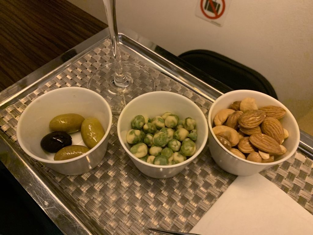 Der Start in Singapur erfolgte dann bei dem überpünktlichen Boarding auch auf die Minute genau und als 15 Minuten nach dem Abheben die Anschnallzeichen ausgeschaltet wurden, servierte man mir direkt und ohne Umschweife ein weiteres Glas Champagner, diesmal zusammen mit einigen Nüssen und Oliven.