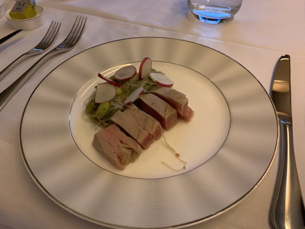 Nachdem ich den Thunfisch als kalte Vorspeise bestellt habe, wurde mein Tisch sehr schnell eingedeckt und auch die Vorspeise serviert. Leider hat mir der Thunfisch nicht wirklich geschmeckt, wofür wohl aber weniger der Koch an Bord, als das Catering in Singapur was konnte.