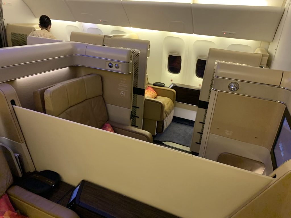 Man muss aber ehrlich sagen, dass das Bett für eine First Class recht schmal war und dass es hier Airlines gibt, die mehr Platz bieten, was gerade beim Schlafen viel ausmacht. Wer würde schon in einem 5 Sterne Hotel ein Bett mit 70cm Breite akzeptieren?