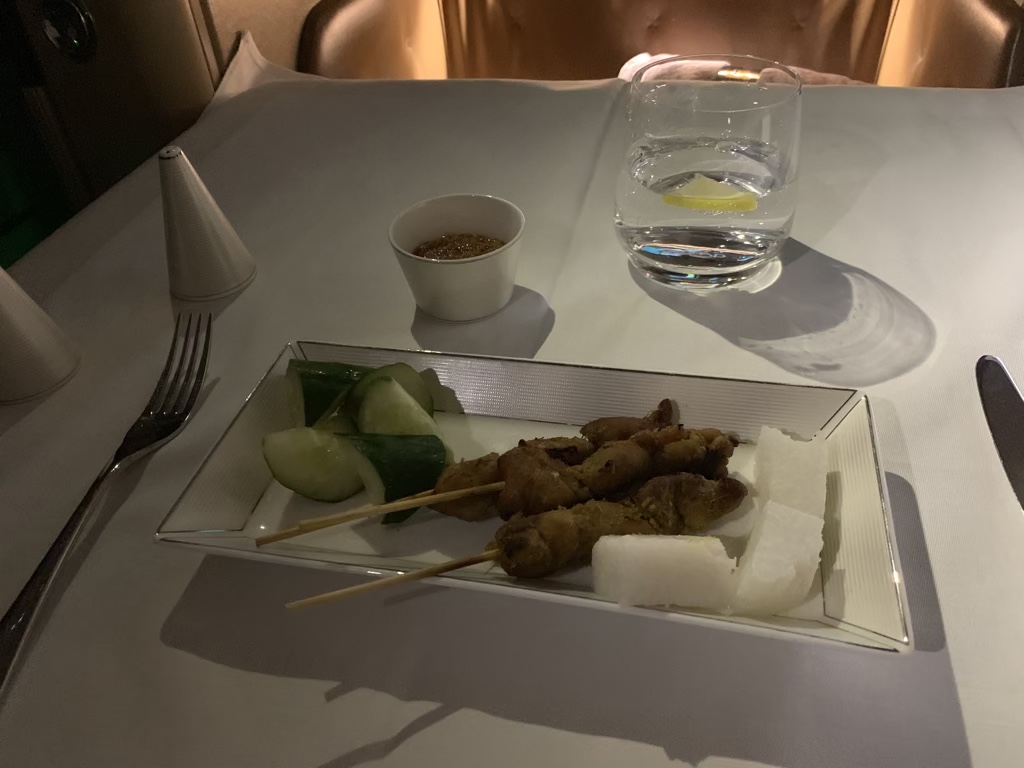 Zwei Cappuccino später habe ich 60 Minuten vor der Landung noch etwas von der Snack Karte bestellt. Es hat etwa zehn Minuten gedauert, bis mein Tisch eingedeckt wurde und die Saté Spieße als Vorspeise serviert wurden.
