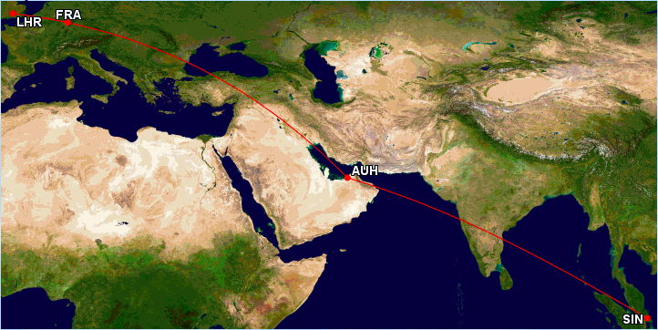 Ich habe den Flug von Singapur über Abu Dhabi und London nach Frankfurt mit American Airlines Meilen gebucht, da hier nur 90.000 Meilen und etwa 80 Euro an Steuern und Gebühren angefallen sind. Übrigens ist hier der Löwenanteil von 56 Euro an Gebühren für den Flug von London Heathrow nach Frankfurt mit British Airways entfallen.