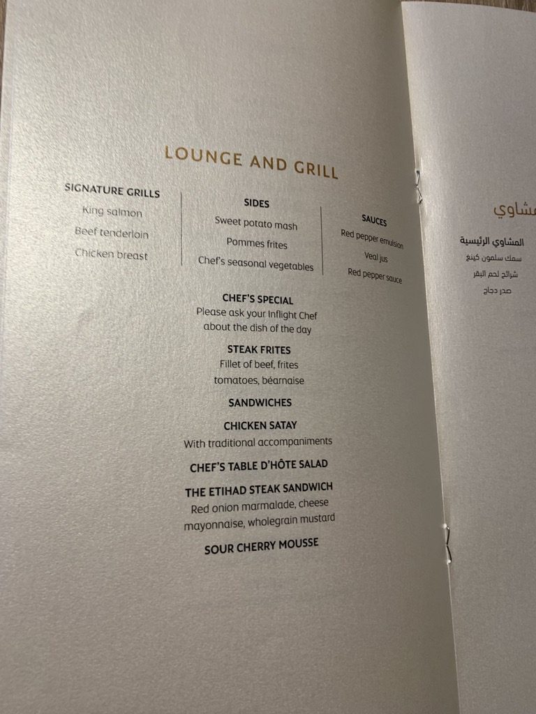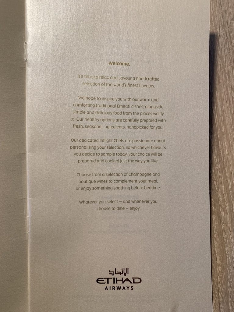 Kurz nach dem Champagner kam der Koch zu mir und wollte meine Essenswünsche für den Flug mit mir durchsprechen. Dabei bietet Etihad Airways in der First Class eine Dine on Demand Konzept an, bei welchem sich die Passagiere aus einer Karte das Essen zusammenstellen können, wie sie wollen.