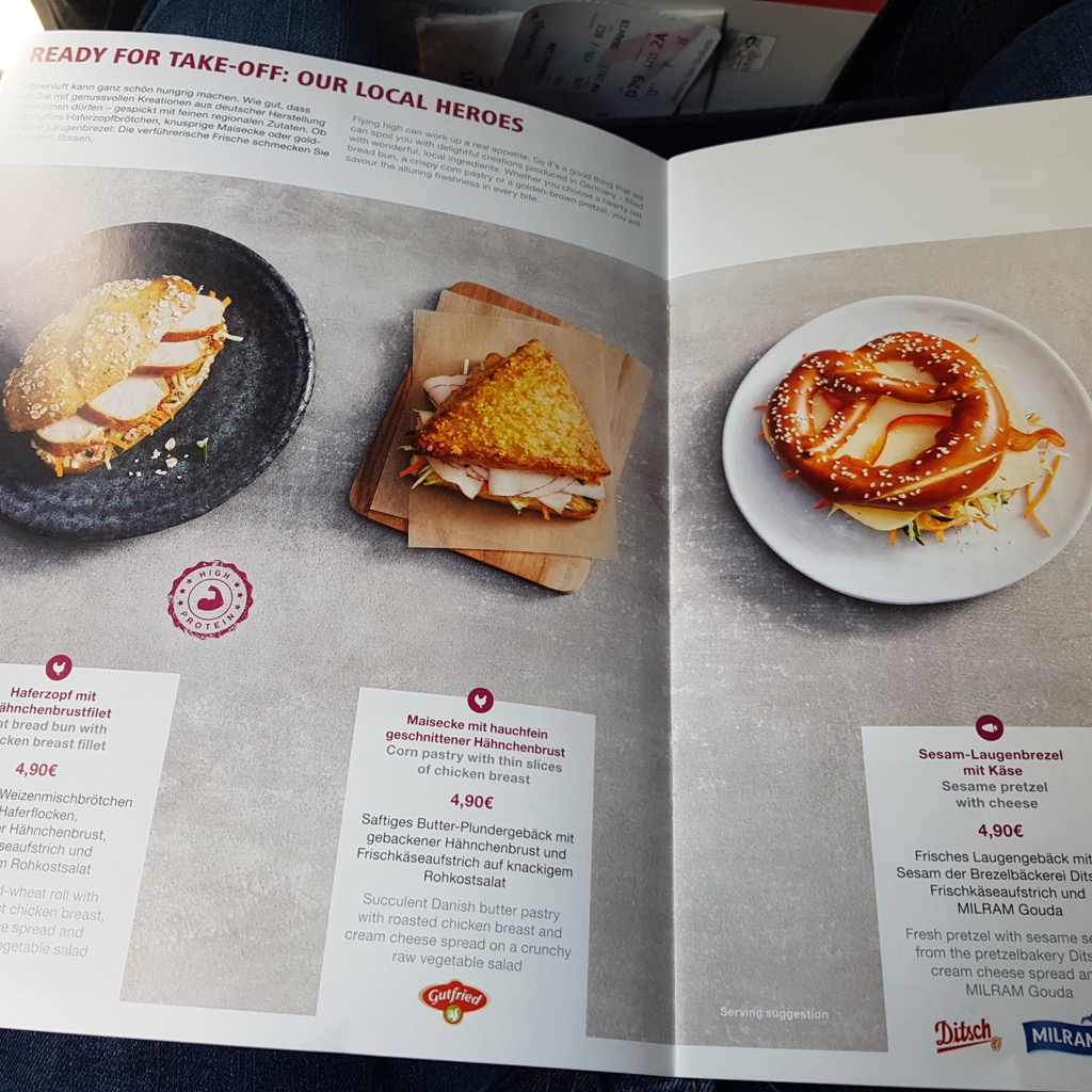 Bei Lufthansa bekommt man innereuropäisch ein Tablett, ohne wirkliche Auswahlmöglichkeit. Wer kalten Fisch nicht mag kann also durchaus mal Pech haben. Bei Eurowings kann man einfach aus dem Bord-Bistro nach Herzenswunsch bestellen. Eine Mengenbeschränkung konnte ich nicht bestätigen, aber Hamstern ist wohl verboten. Ich entschied mich für einen Brezel mit Käse, die Erwartung an einen „Ditsch“-Brezel wurde nicht erfüllt. Geschmacklich kein Höhepunkt und eher papig wie einfache Aufbackware mit zäher Konsistenz – für ein Flugzeugsandwich aber erträglich, hatte schon schlimmeres.