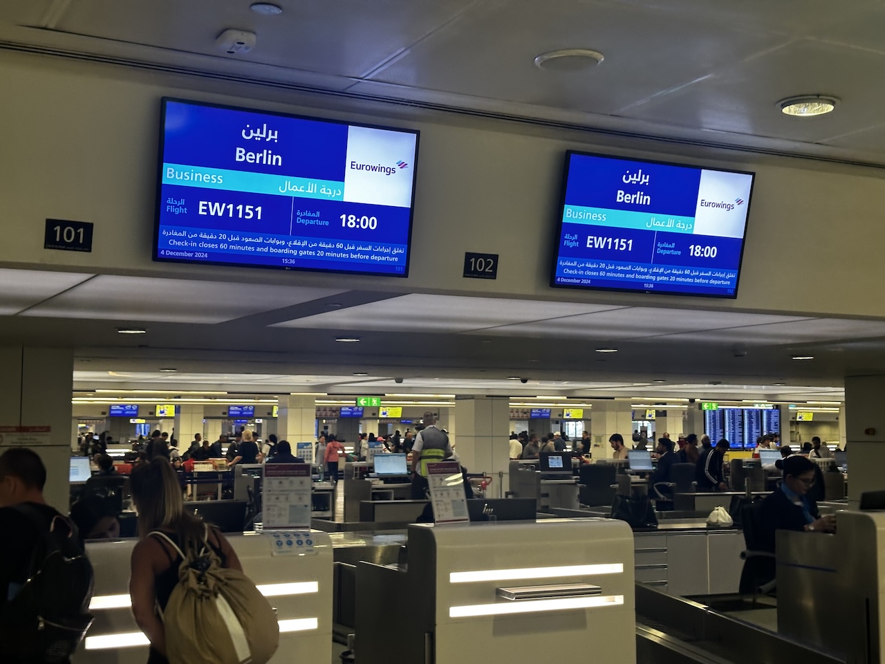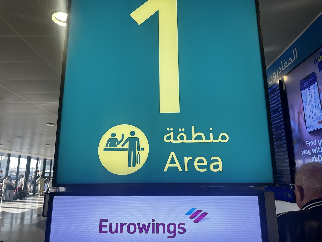 Die letzte Nacht vor dem Heimflug war ich im Hyatt Regency Dubai Creek Hights, die Fahrt zum Flughafen dauerte von dort nur 15 Minuten. Am Terminal 1 angekommen habe ich schon das Eurowings Logo gesehen und bin zum Schalter. Dort war kaum was los, die Airline hatte drei Desks, einer davon für Statuskunden und BIZclass Gäste. Ich habe diesmal meinen Trolley mit in die Kabine genommen, da es im Flugzeug wieder die großen Ablagefächer gab.