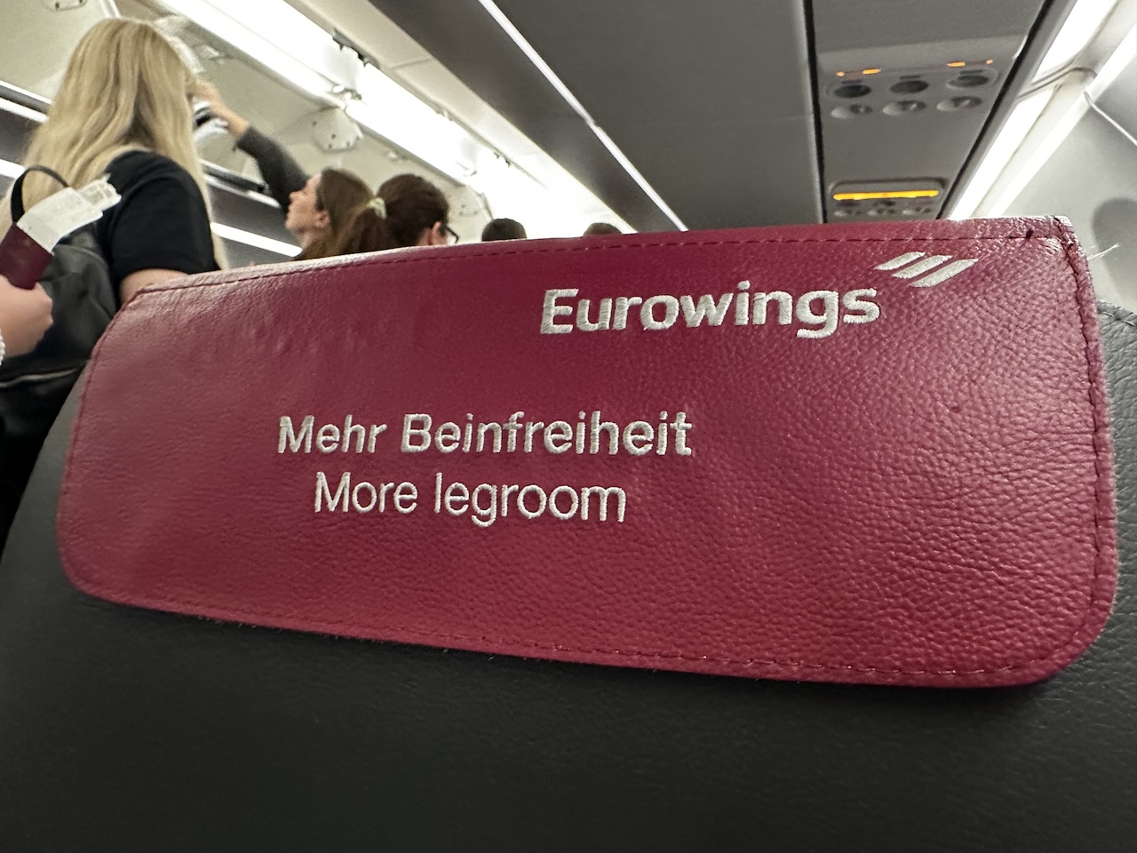 Die Unterschiede zwischen den beiden Eurowings Klassen halten sich in Grenzen, was die Hardware angeht lässt das Produkt ziemlich zu wünschen übrig. Ich hatte Glück und die ganze Reihe für mich, daher konnte ich mich ausbreiten und jederzeit aufstehen ohne jemanden zu stören. Der Vorhang als Klassentrennung fehlt, dadurch geht das leicht bessere Raumgefühl flöten, an der Toilette standen fast durchgehend Passagiere in der Warteschlange.