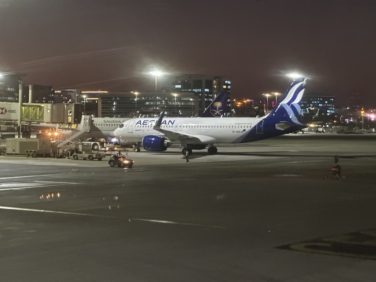 Wir rollten los, draußen wurde es inzwischen dunkel. Der Weg zur Startbahn war ziemlich weit, unterwegs „trafen“ wir noch ein paar andere Airlines, die mit Schmalrumpfflugzeugen nach Dubai kommen. Nun gut, Aegean Airlines hat es aber auch nicht so weit bis zu deren Drehkreuz in Athen.