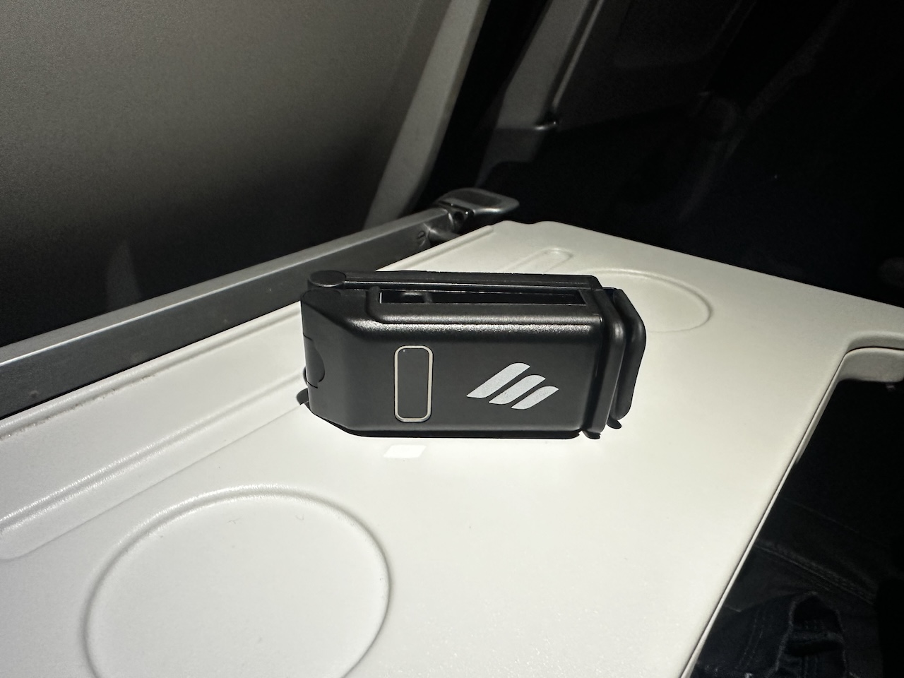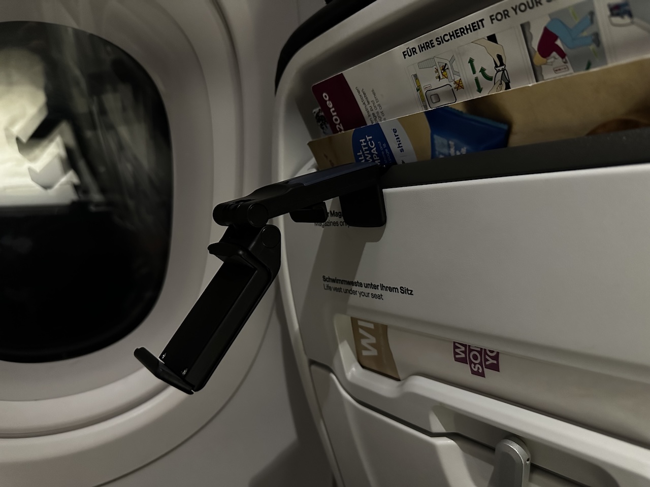 Wie auf dem Hinweg wurden natürlich auch in der BIZclass die Halterungen für eigene Endgeräte ausgeliehen. Heute notierte sich die Flugbegleiterin, welche Passagiere den Service in Anspruch genommen haben. Damit wusste sie wo sie die Halterungen vor der Landung wieder einsammeln musste.