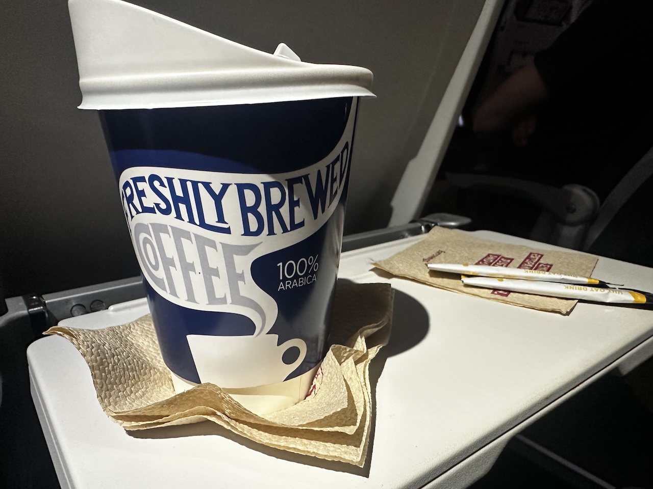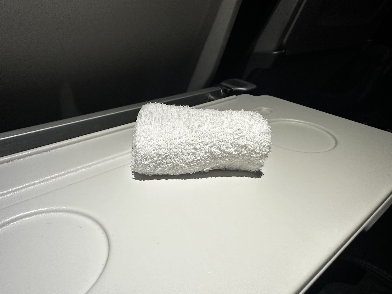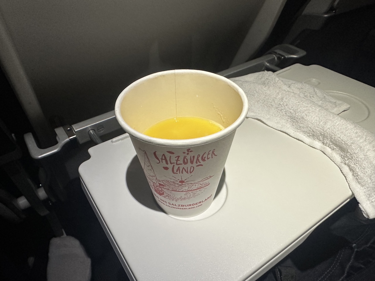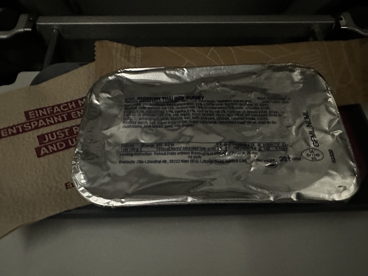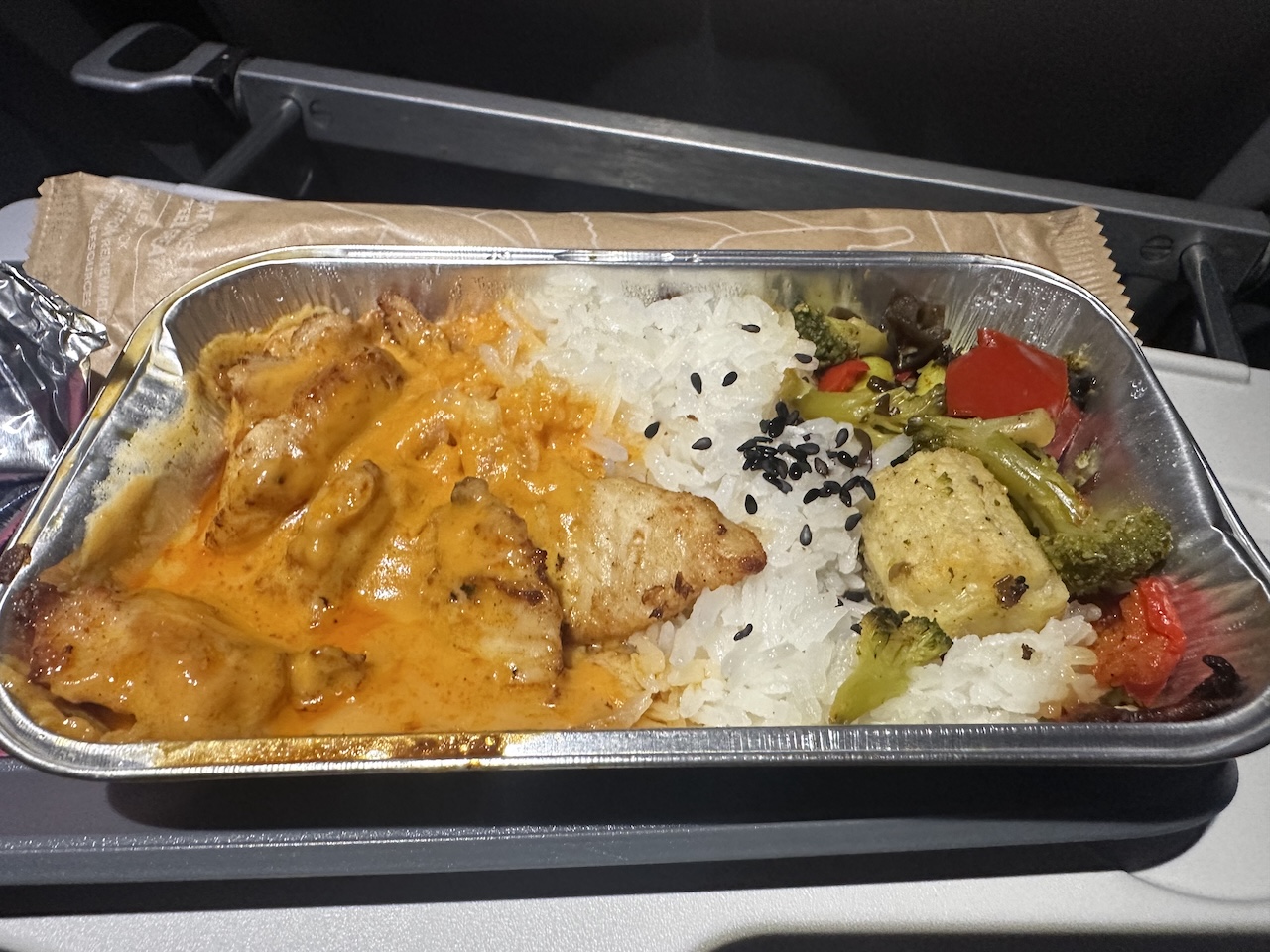 Am Boden wird zwar kein Service gemacht, nach dem Start gab es aber gleich einen Becher Orangensaft und heiße Tücher. Danach wurde ein kleines Tablett mit warmen Essen ausgeteilt. Zur Wahl standen Hühnchen Curry und eine vegetarische Pasta. Die kleine Mahlzeit wurde mit einem weiteren Getränk nach Wahl gereicht.