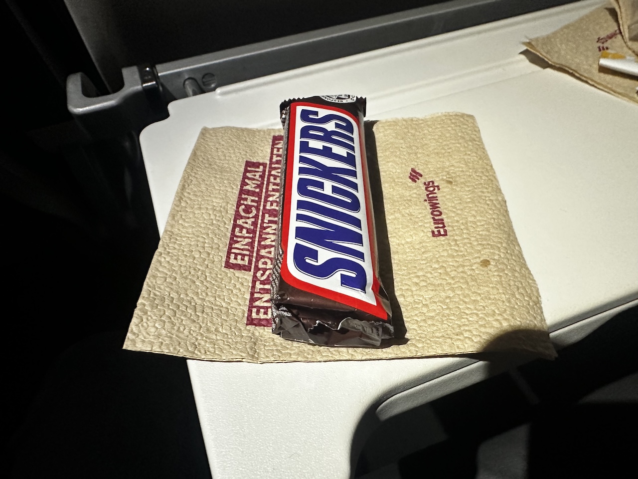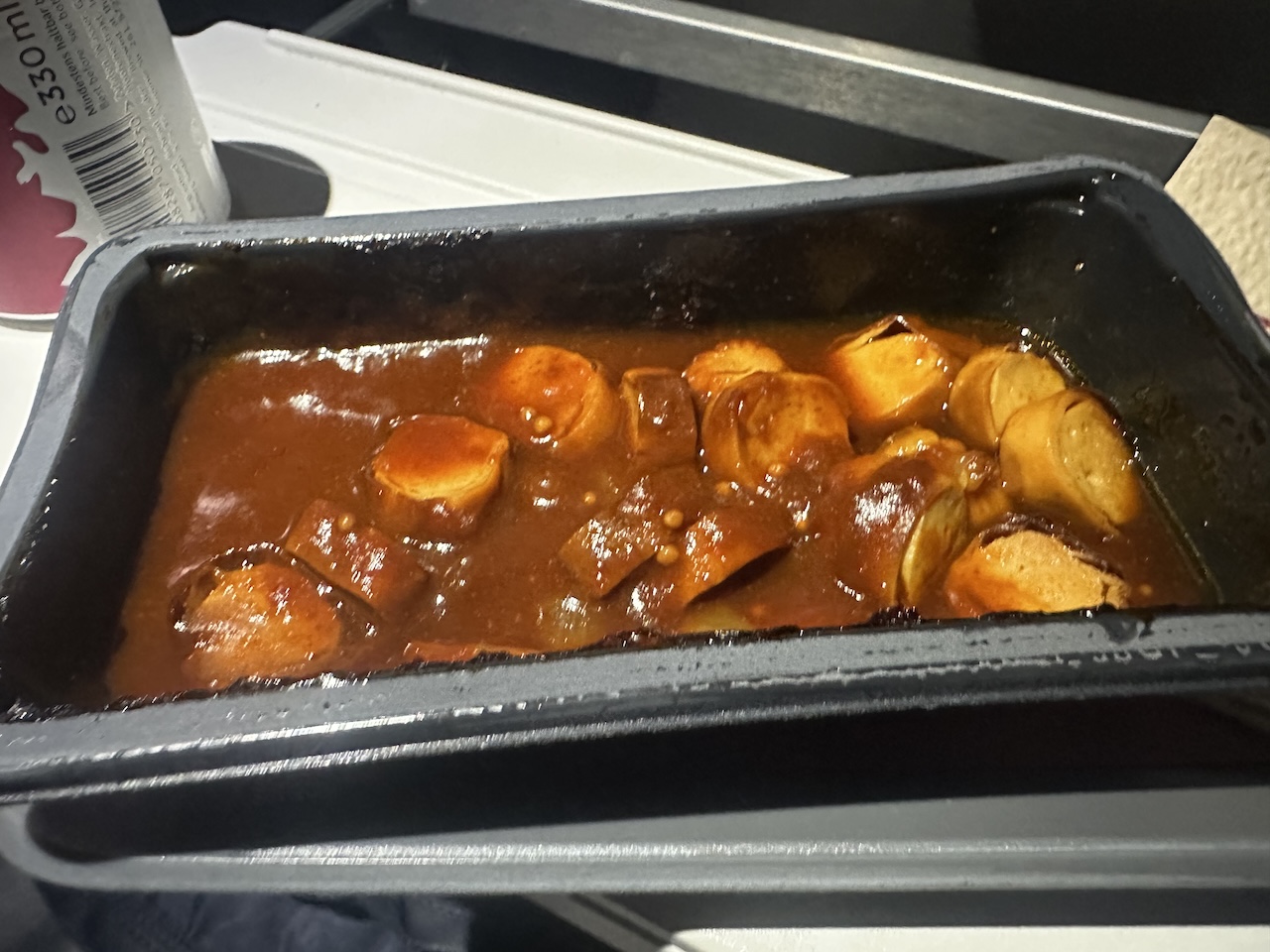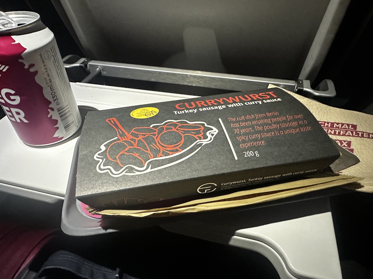 Im Sortiment sind auch Sandwiches und weitere warme Mahlzeiten wie die Currywurst, die ich mir gegen Ende des Fluges geordert habe. Wer möchte, kann hier auch alkoholische Getränke bestellen, Spirituosen sind ebenfalls inklusive.