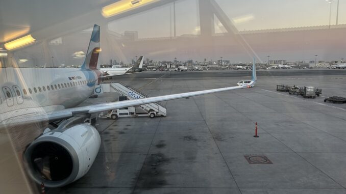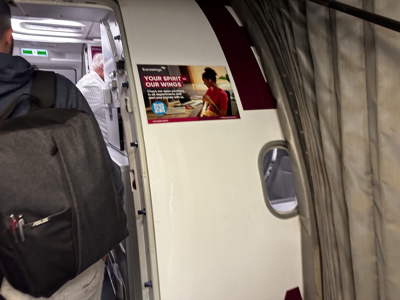 Um den Gatebereich zu betreten, musste man schon die Bordkarte scannen, hier war auch schon eine separate Tür für BIZclass Kunden. Nach einer kurzen Wartezeit ging es schon los, das Boarding startete mit genau dieser Gruppe. Heute waren 27 der 32 Sitze gebucht, einige Passagiere der Klasse hatten also eine ganze Reihe für sich alleine.