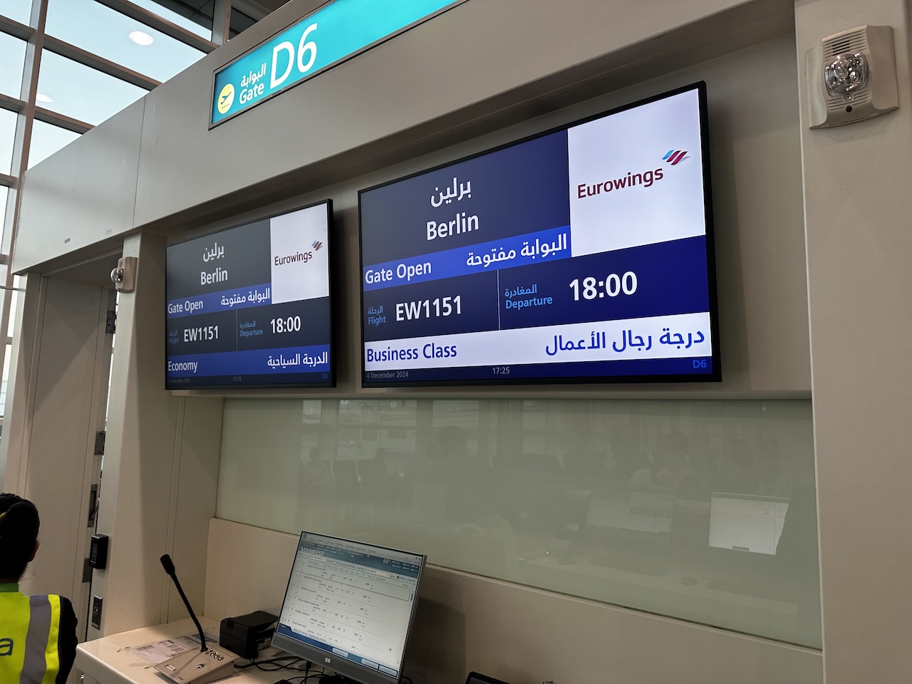 Die Agentin notierte mir noch den Namen der Lounge auf die Bordkarte, kurze Zeit später war ich bereits im Sicherheitsbereich. Eurowings fliegt um 18 Uhr ab, zu dieser Zeit ist die Lufthansa Lounge noch geschlossen. Die Airline schickt daher die berechtigten Kunden in die Ahlan Business Lounge.