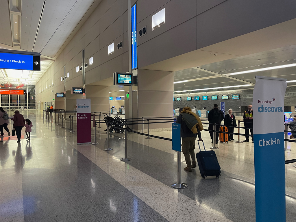 Am Flughafen gab es dann ein paar Schalter, die ganz in Eurowings Discover Farben und Logos geschmückt waren. Dort stellte ich mich drei Stunden vor Abflug an. Eine ältere Dame brüllte die Menschen in der Schlange auf Englisch und einem interessant klingenden Deutsch an „Passports out! Pässe raus! No boarding without passports!“.