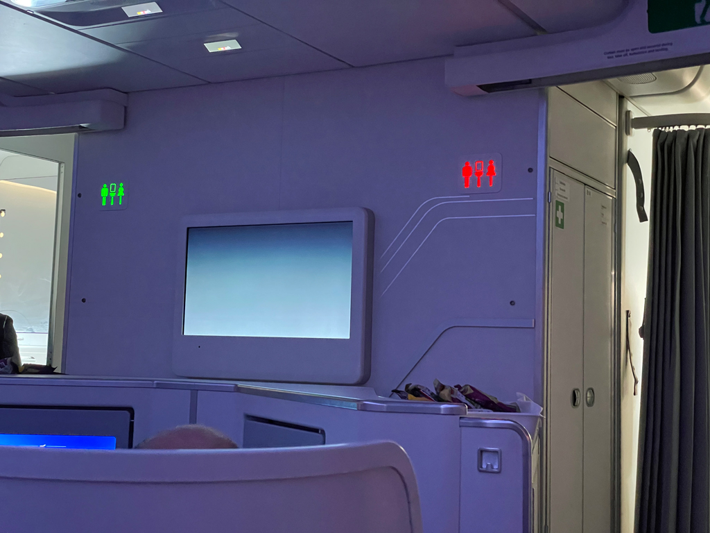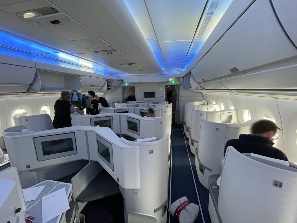 Hinter der zweiten Tür folgt noch eine weitere Business Class Kabine mit 14 Sitzen, die auf diesem Flug jedoch als Premium Economy Plätze genutzt wurden.