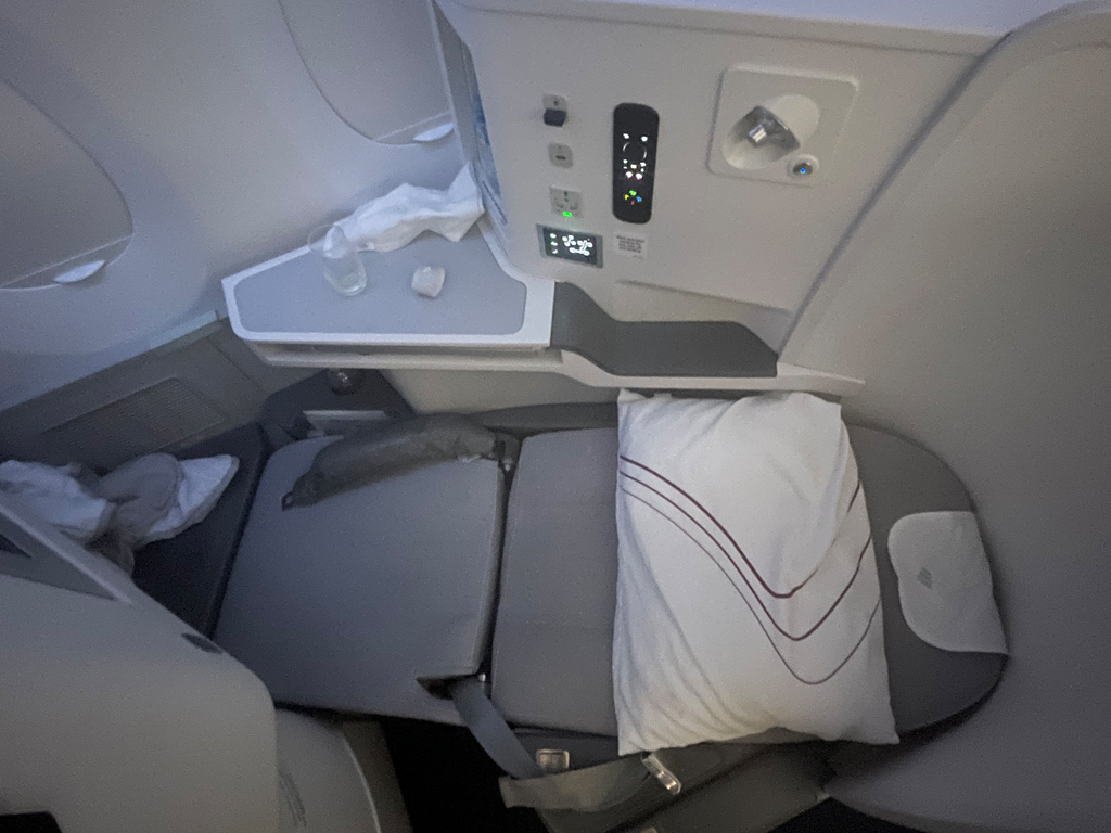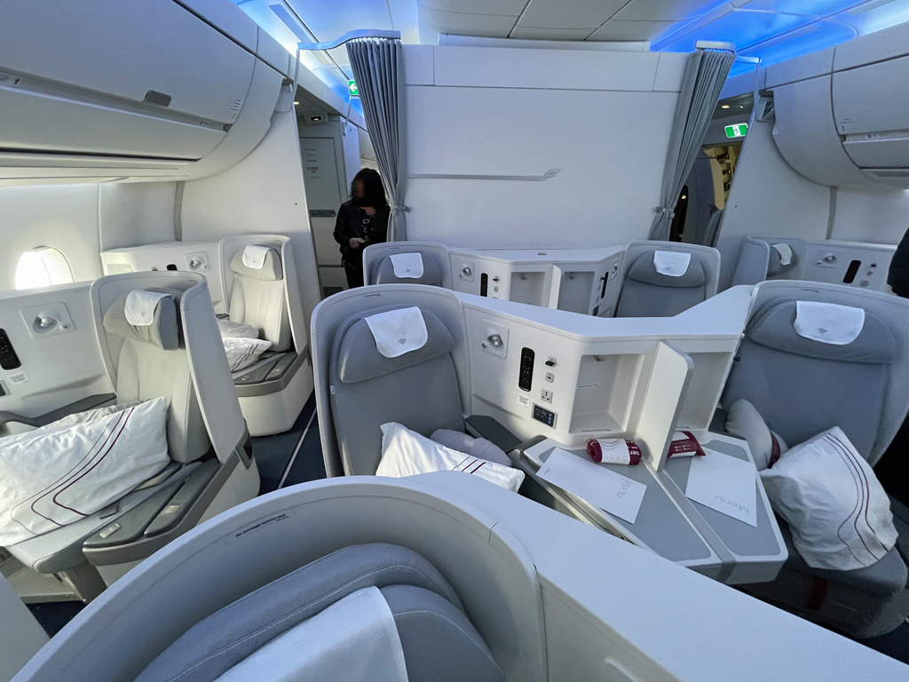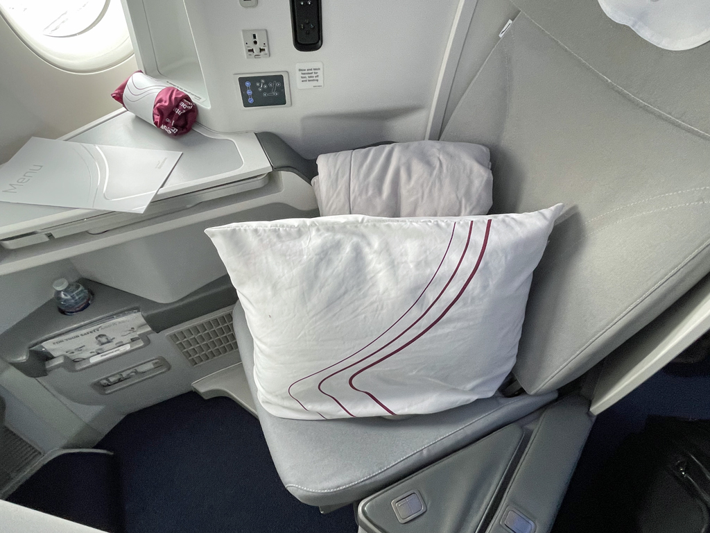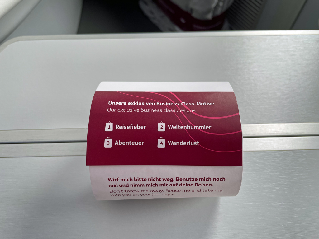Auf den Sitzen befanden sich bereits Decken, Kissen und Amenity Kits. Die Flaschenhalter waren mit Wasserflaschen bestückt und die Menükarte lag auf dem Tisch bereit.
