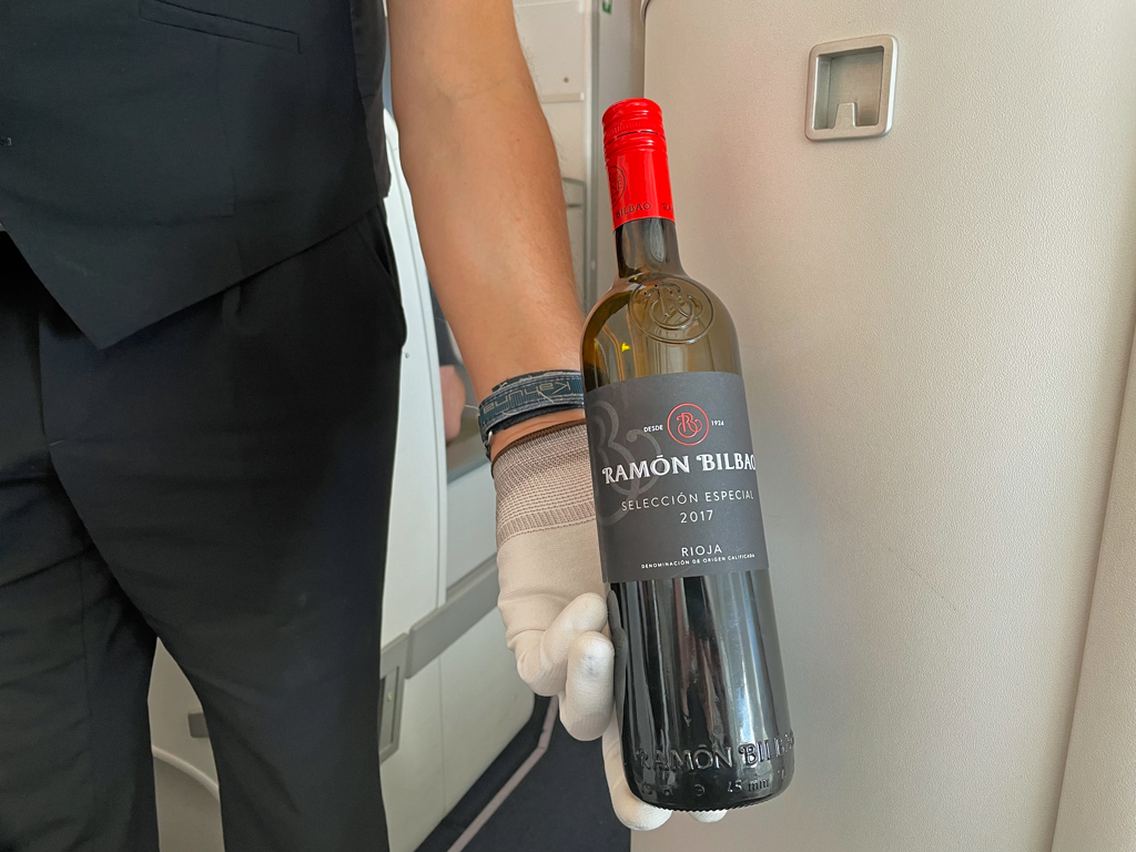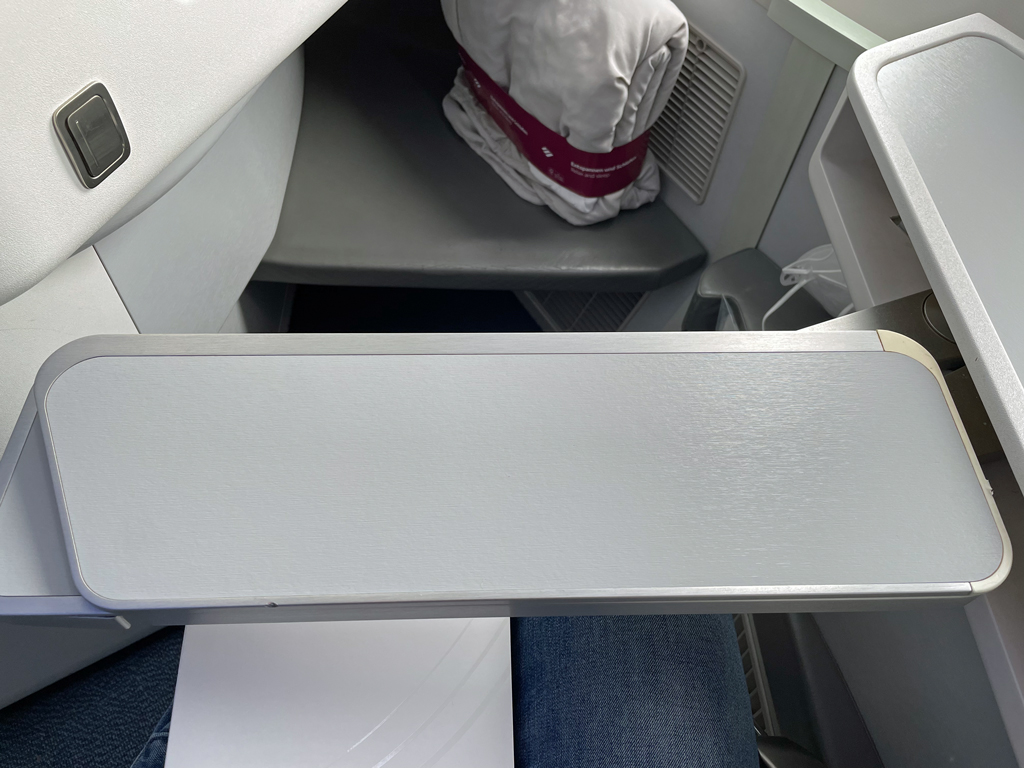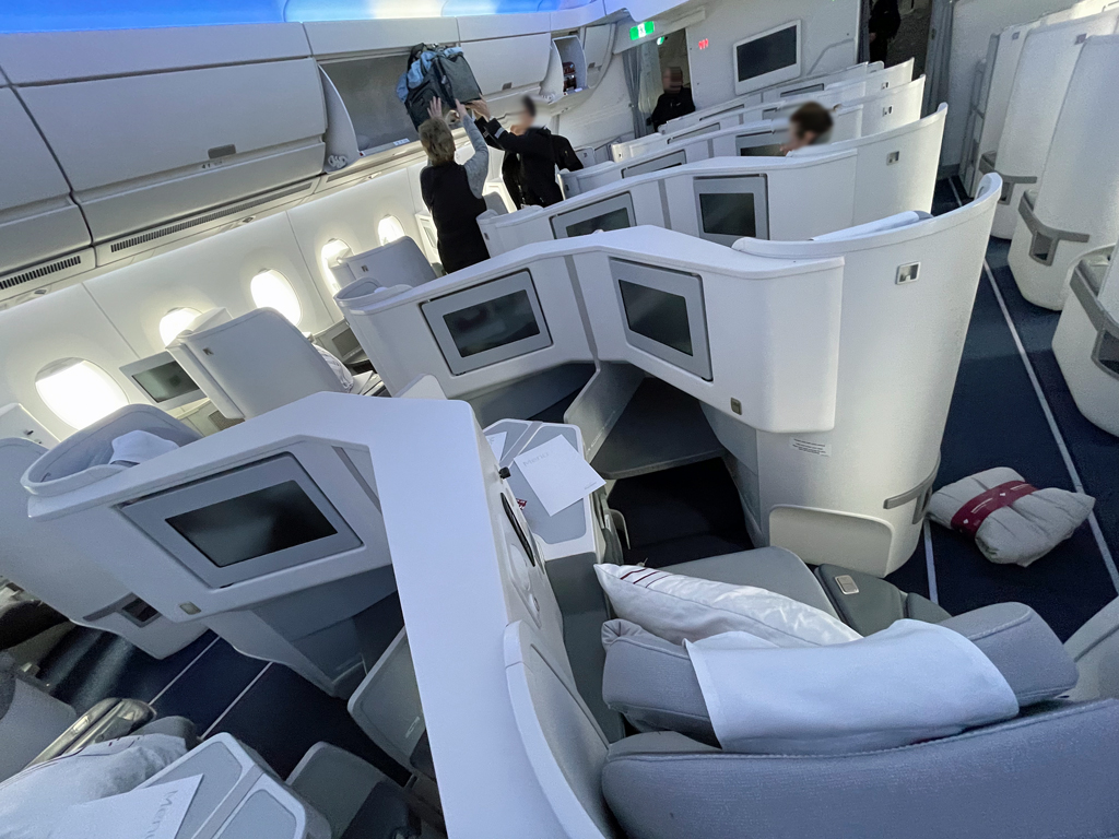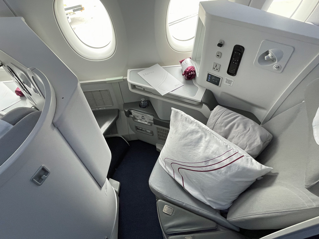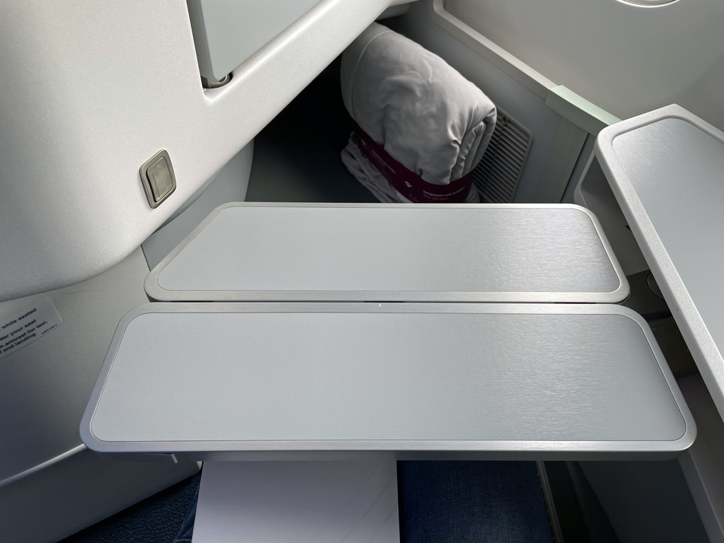 Auf den Sitzen befanden sich bereits Decken, Kissen und Amenity Kits. Die Flaschenhalter waren mit Wasserflaschen bestückt und die Menükarte lag auf dem Tisch bereit.