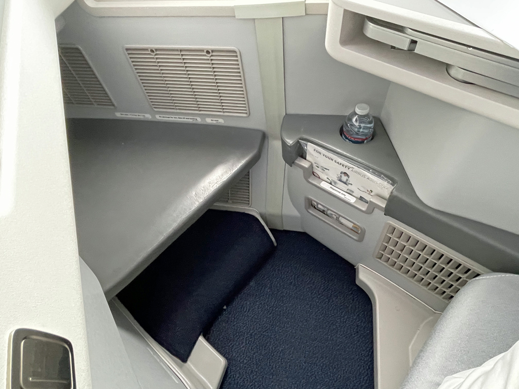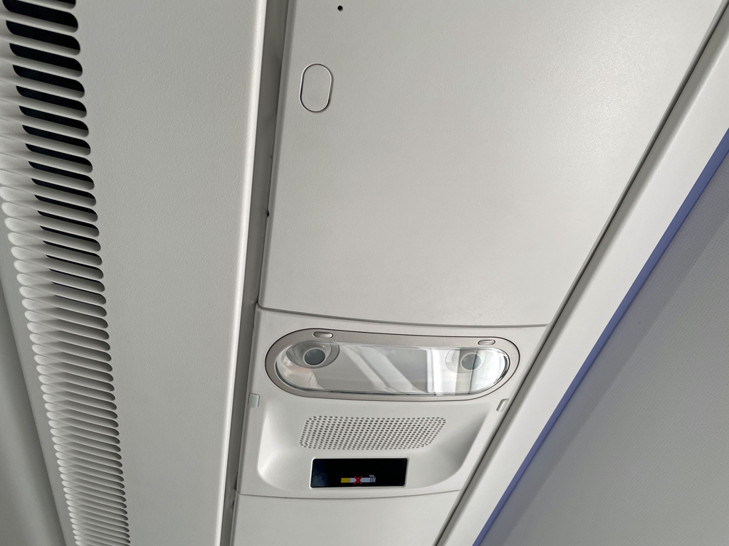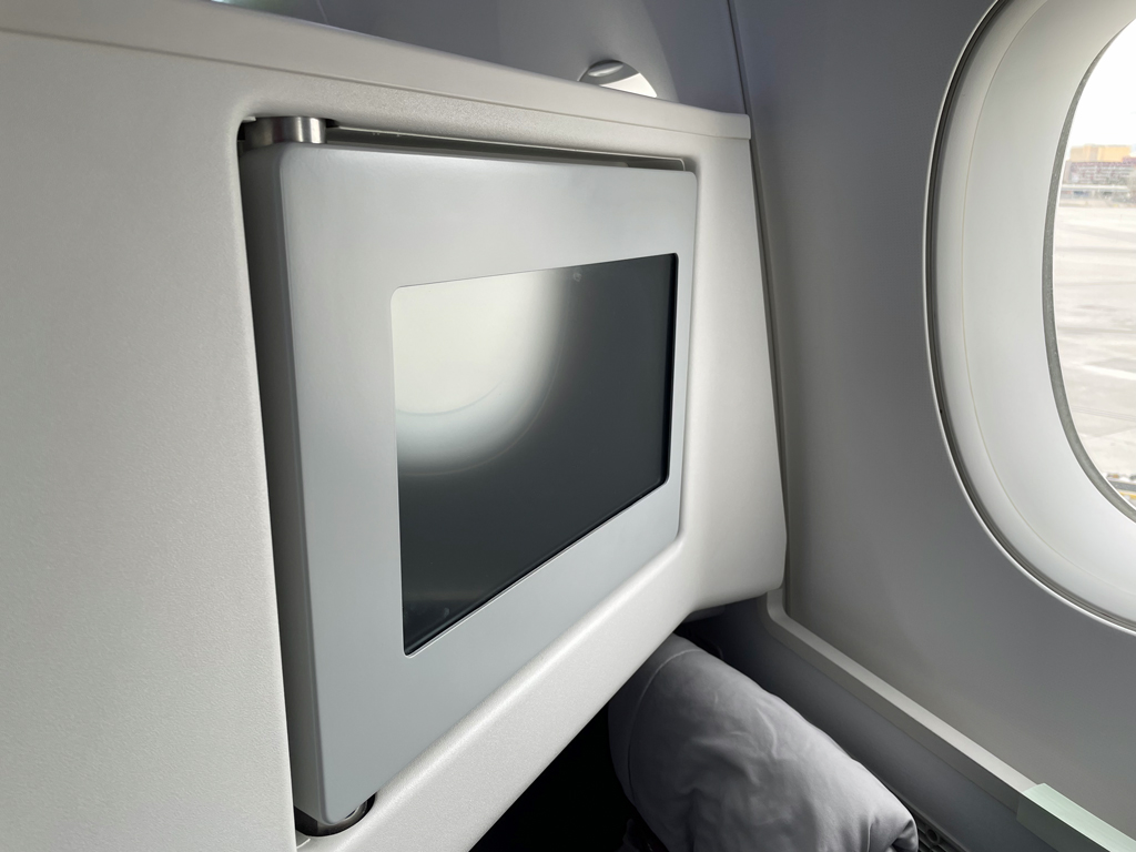 In meinem Sitz hatte ich direkt an meiner rechten Seite die Wand mit den Bedienelementen für den Sitz, darüber eine internationale Steckdose. Ein kleines Stück weiter oben eine USB-C Buchse und noch ein kleines Stückchen höher eine Buchse für die Kopfhörer.