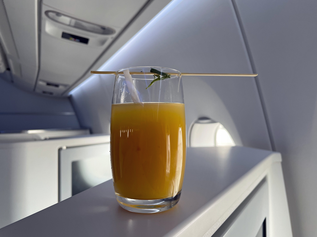 Kurz nachdem ich an Bord kam wurde ich freundlich von der finnischen Crew begrüßt. Nach wenigen Augenblicken kam auch schon ein Flugbegleiter mit einem Tablett mit Willkommensgetränken vorbei. Zur Auswahl standen Wasser, Sekt oder der Eurowings Discover Signature Mocktail. Der erste hatte eine kleine Plastikeinwaage in Form eines Plastiksiegels von einer Flasche. Daher ließ ich ihn schweren Herzens postwendend zurückgehen. Mir wurde unverzüglich ein neuer Drink gebracht. Der hatte zwar kein Plastik in sich, dafür aber auch keine Minze.