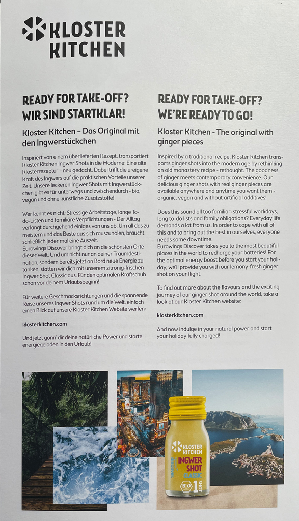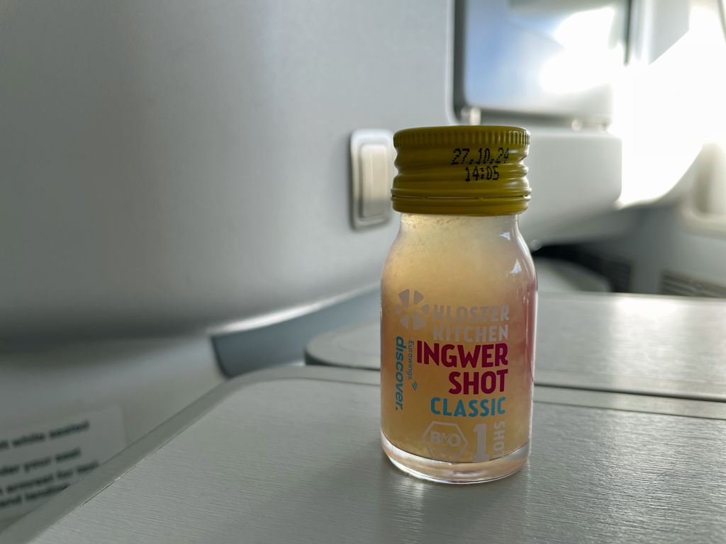 Im Menü macht Eurowings Dicover Werbung für einen anscheinend besonderen Ingwer Shot. Diesen erhielt man lediglich auf Nachfrage bei der Crew.