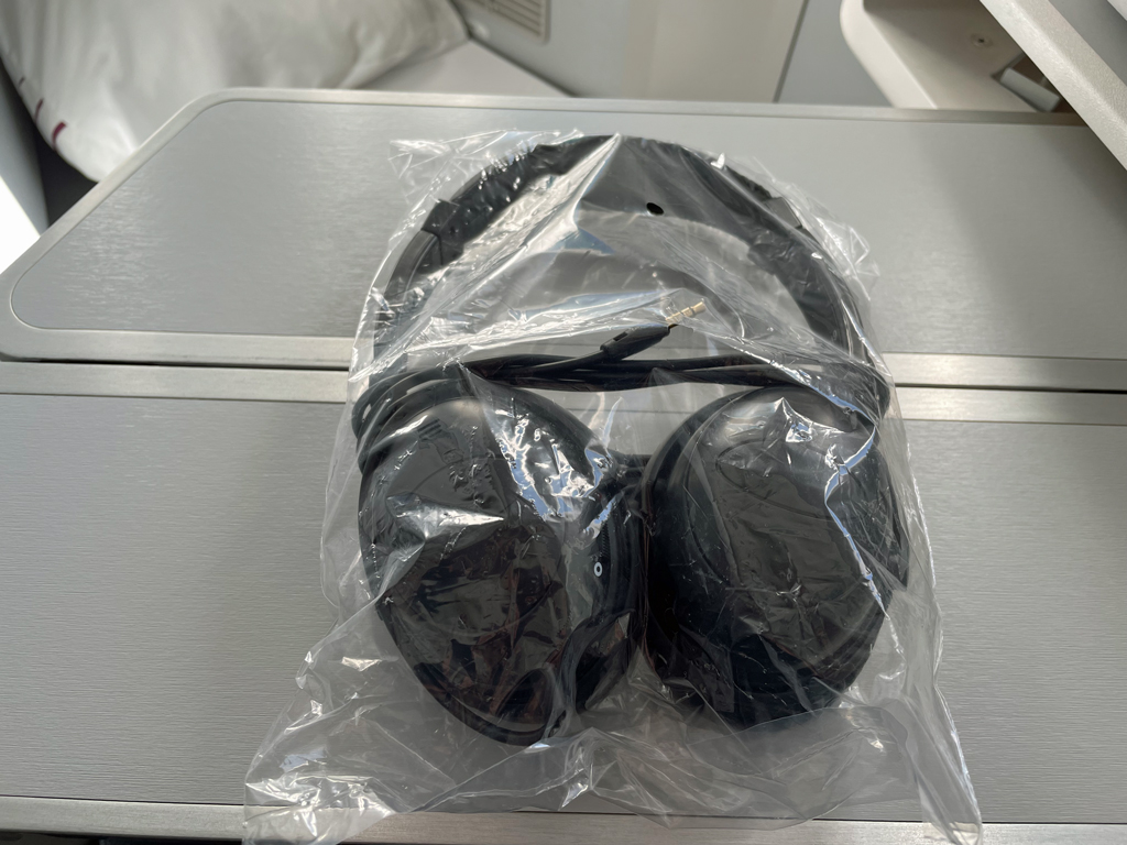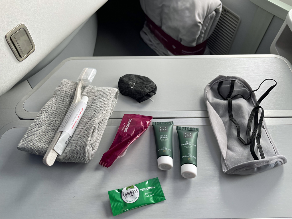 Das Amenity Kit enthält Socken, eine Zahnbürste mit Zahnpasta, Überzieher für die Kopfhörer, Ohrstöpsel, eine Schlafmaske, Gesichts- und Handcreme von Rituals (The Ritual of Jing) und Minzpastillen. Damit enthält es alles Wesentliche und machte einen hochwertigen Eindruck. Die Schlafmaske hatte zur besseren Anpassung an die Kopfform bzw. zur Reduktion des Drucks auf den Augen zwei Gummizüge. Auch die Kosmetika von Rituals sind so dimensioniert, dass man diese noch ein paar Tage nach dem Flug weiterverwenden kann.