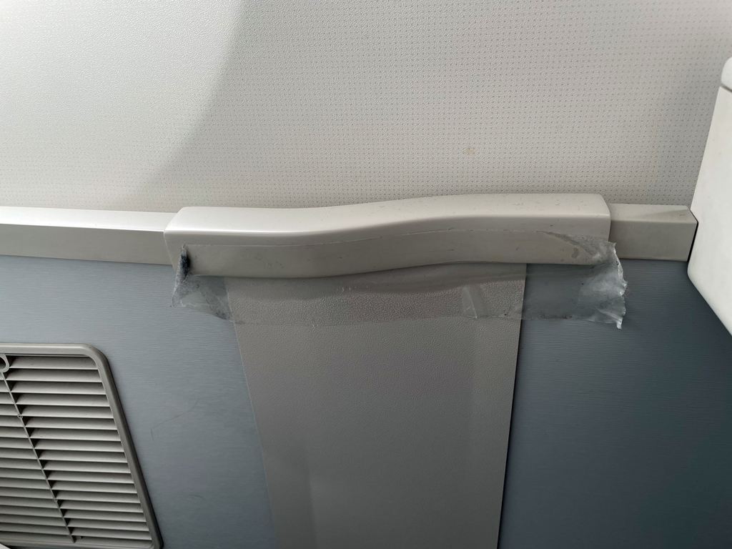 Vor der „Wand“ beginnt ein in etwa dreieckiger Tisch. Direkt unterhalb der Tischauflage befindet sich der Esstisch, der dort herausgezogen werden kann. Leider lässt sich der Esstisch nicht nach vorne oder hinten schieben, so dass man den Sitzabstand zum Esstisch über den motorisierten Sitz regulieren muss.