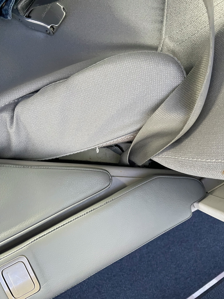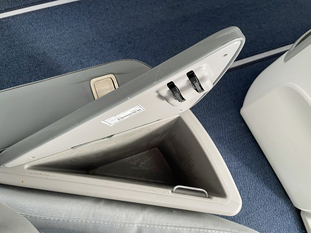 Auf der Gangseite hat der Sitz eine ausfahrbare Armlehne und ein kleines Staufach. Dort befanden sich Kopfhörer. Ansonsten war das Fach so dreckig, dass ich dort nicht hineinlegen wollte.
